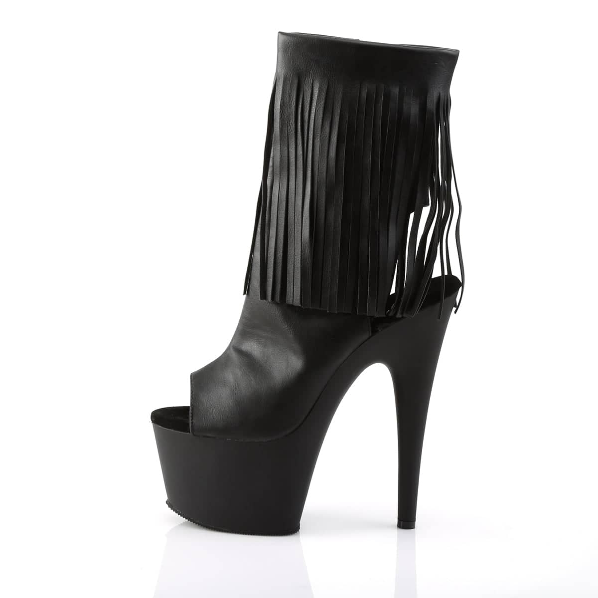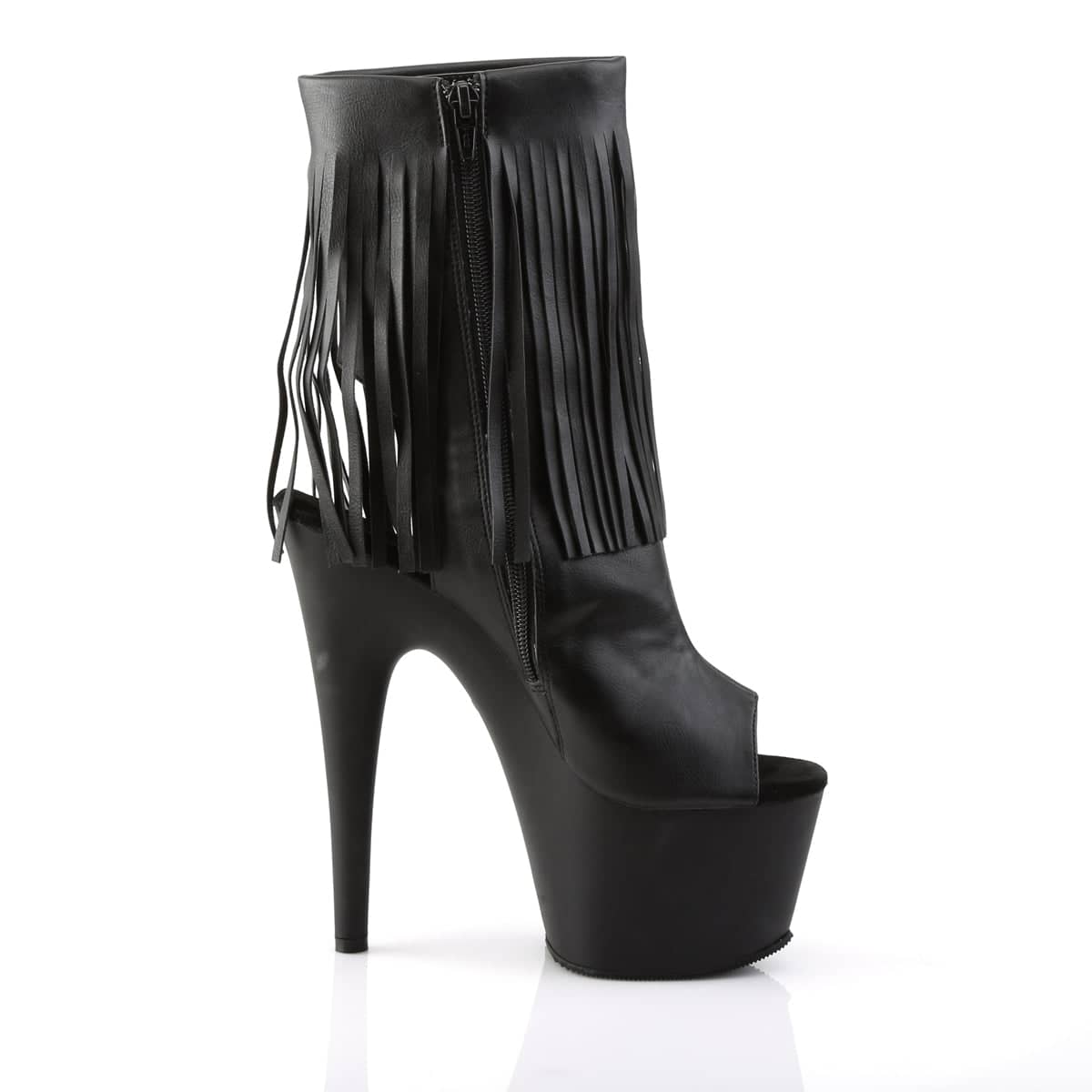 Embrace the wild west with some extra sass in these simply stunning leather fringed boots. These seven inch black faux leather peep toe platforms have a matte base, stiletto heel and inside zip closure.