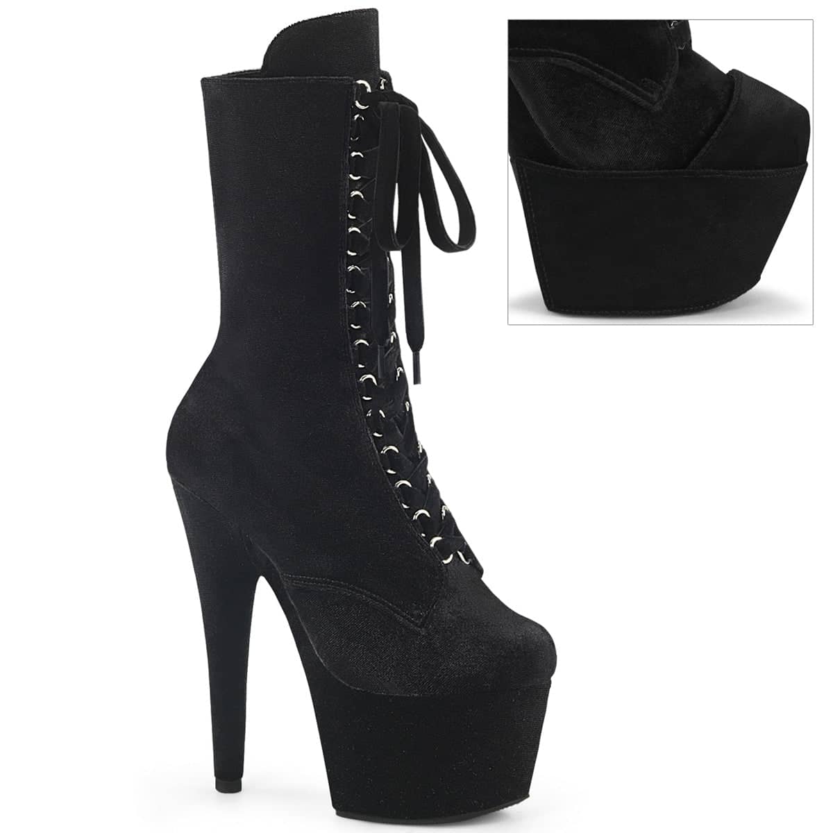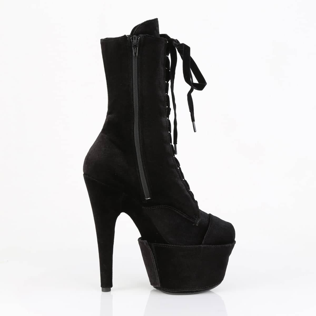 Make every step count in the ADORE-1045VEL Velvet Lace-Up Ankle Boot. A mix of style, attitude, and pure glamour, these boots are designed to leave a lasting impression. Set on a 7″ heel with a 2 3/4″ platform, they add significant height to your statement. With Pleaser’s iconic style code ADORE-1045VEL, this boot stands for everything chic, edgy, and provocative.