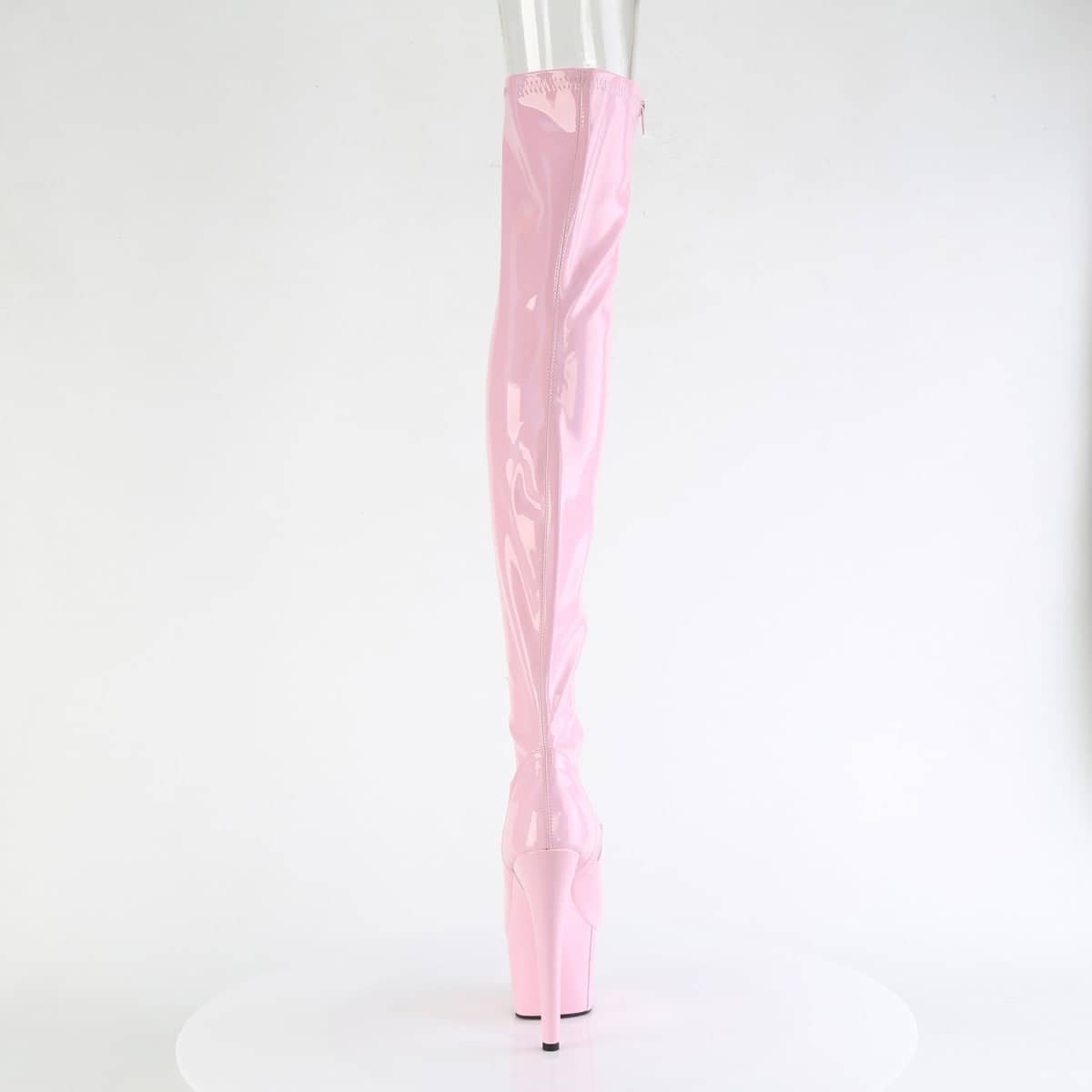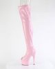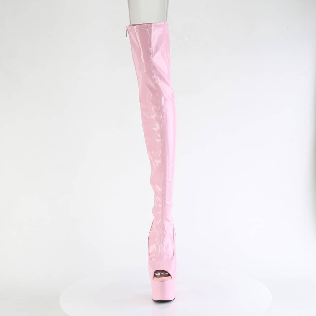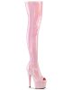 These patent boots have a 7″ Heel on top of 2 3/4″ platform. Our pink thigh high boots have a peep toe style for additional elegance. They are easy to put on and off with the convenient side zip. Try our Adore range for yourself! Available in UK size 2 to UK size 11.