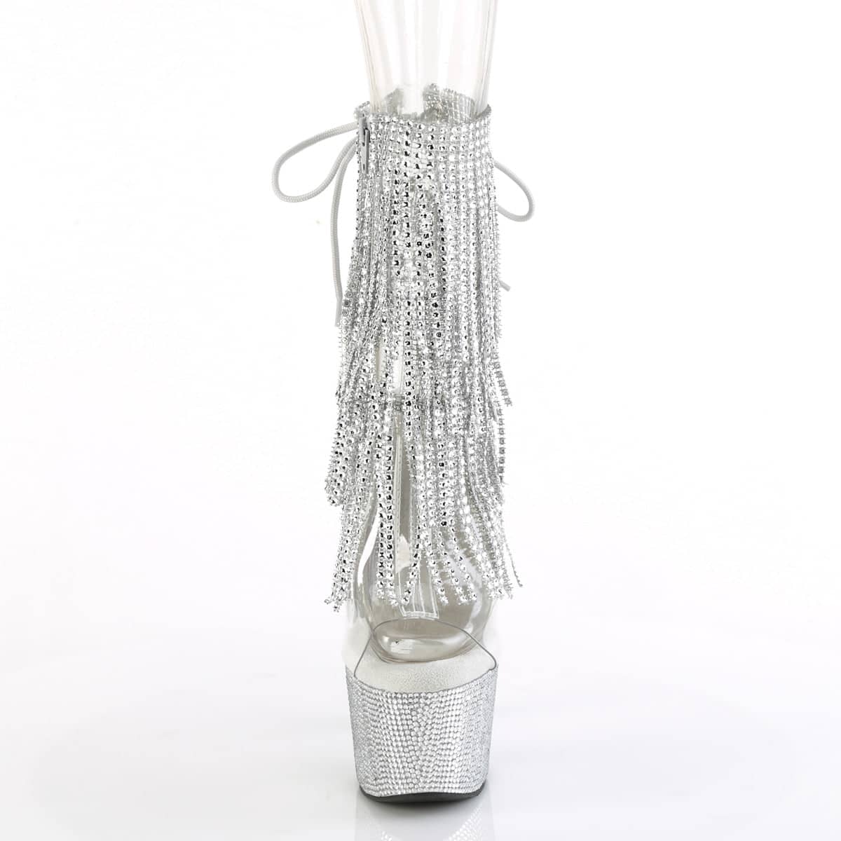 With a 7″ heel and flirty fringe detailing, these clear silver stunners are perfect for adding some pizzazz to any outfit. Plus, they’re made with vegan materials, so you can feel sexy and sustainable at the same time.