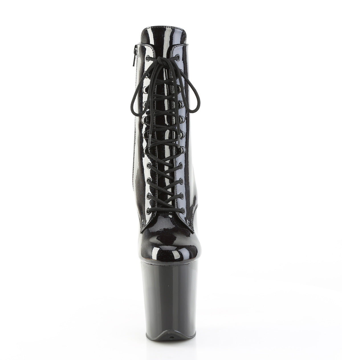 Featuring a sleek side zip and a lace-up front design, the FLAMINGO-1020BLG boots offer an impressive patent finish. Set in a glitter style, the boots ooze an appealing charm that makes them a great fit for various occasions like a pole or fetish event, night out, burlesque, and dance parties.