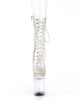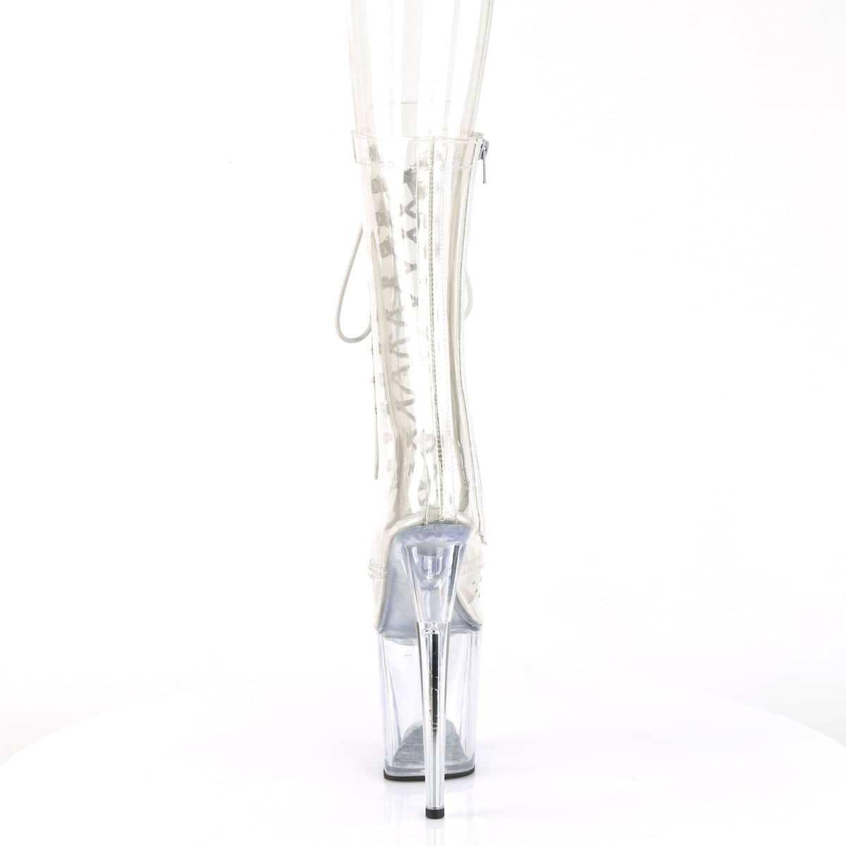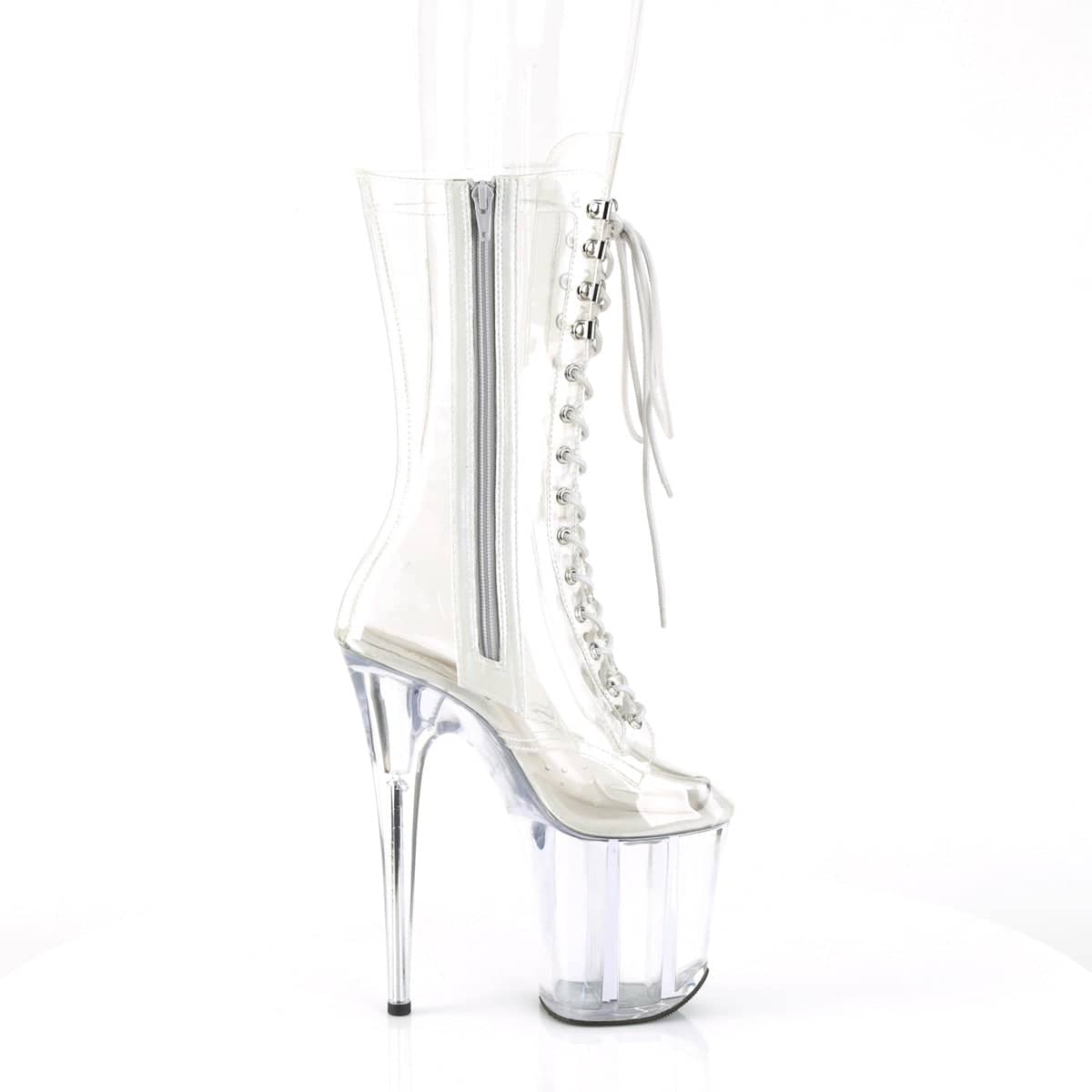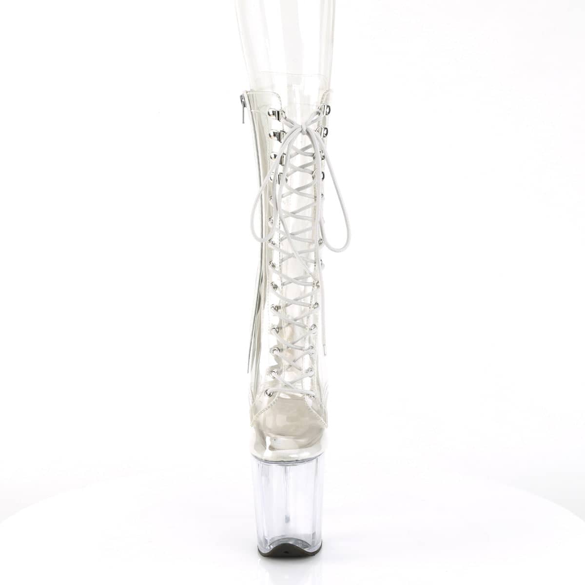 FLAMINGO-1050C Vegan Clear Lace-Up Boots with a 8″” (200mm) Heel and a 4″” (100mm) Platform are the perfect Sexy Shoes to spice up any outfit. Show off those legs with the Mid Calf Boot and Inner Side Zip Closure. Get ready to turn heads with your flirty style in these must-have Vegan boots.
