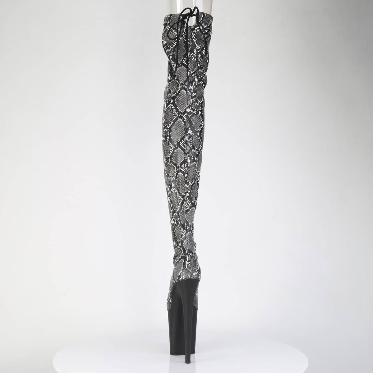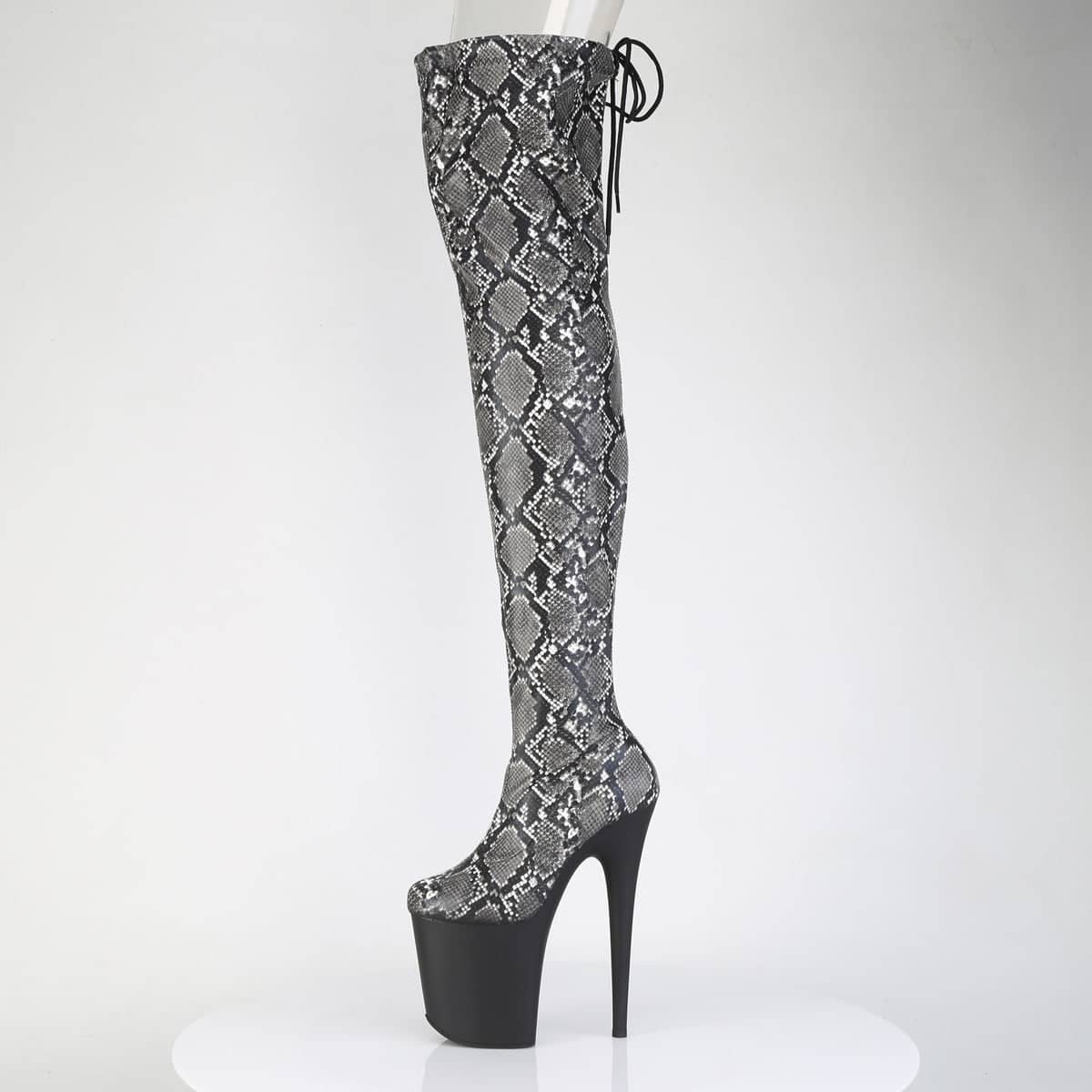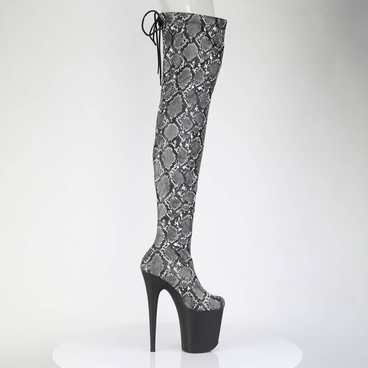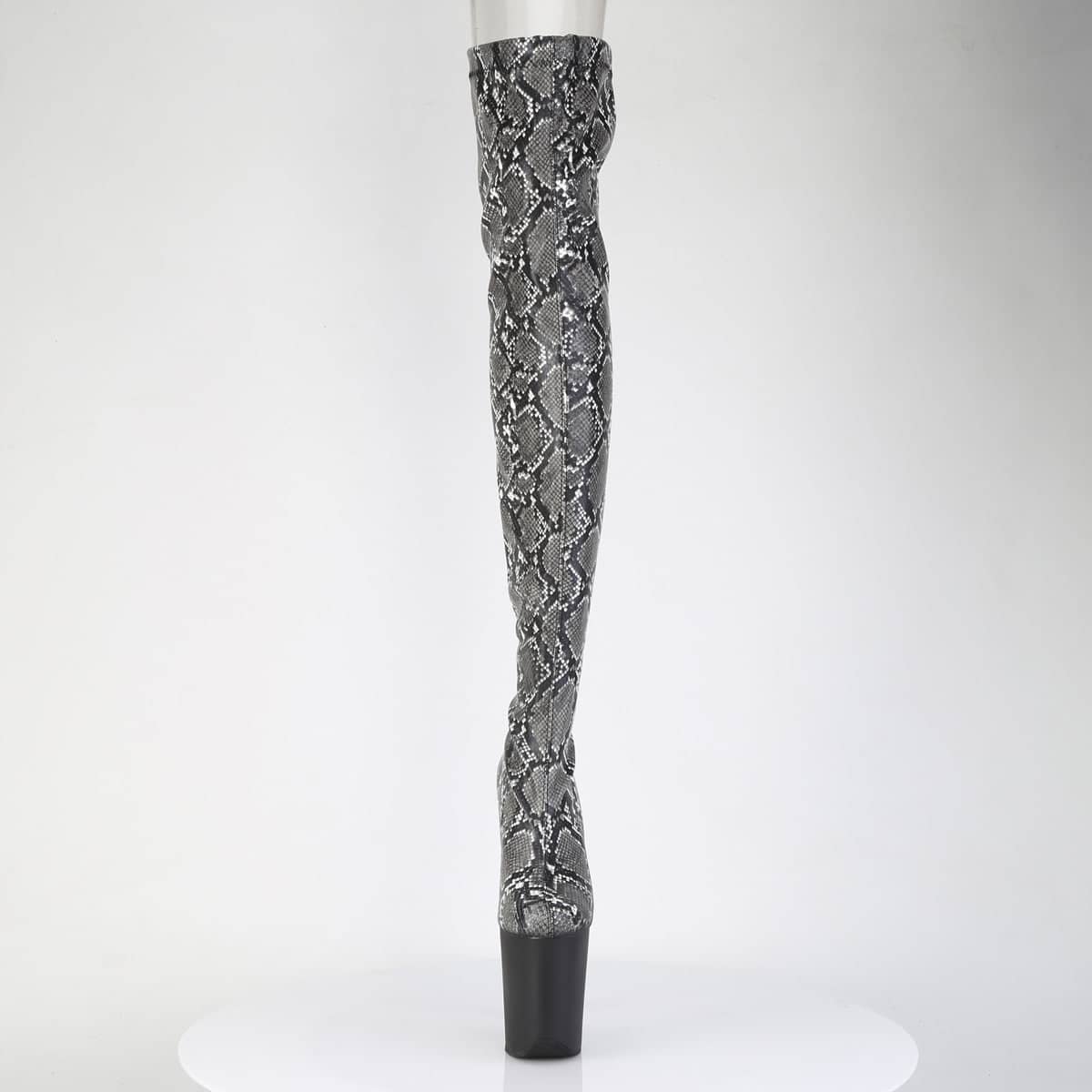 Get ready to step out in style and turn heads in our show-stopping FLAMINGO-3008SP-BT Stretch Snake Print Pull-On Thigh Boots. The ultimate statement piece for your footwear collection, Pleaser proudly introduces this bold, daring option for the adventurous at heart.