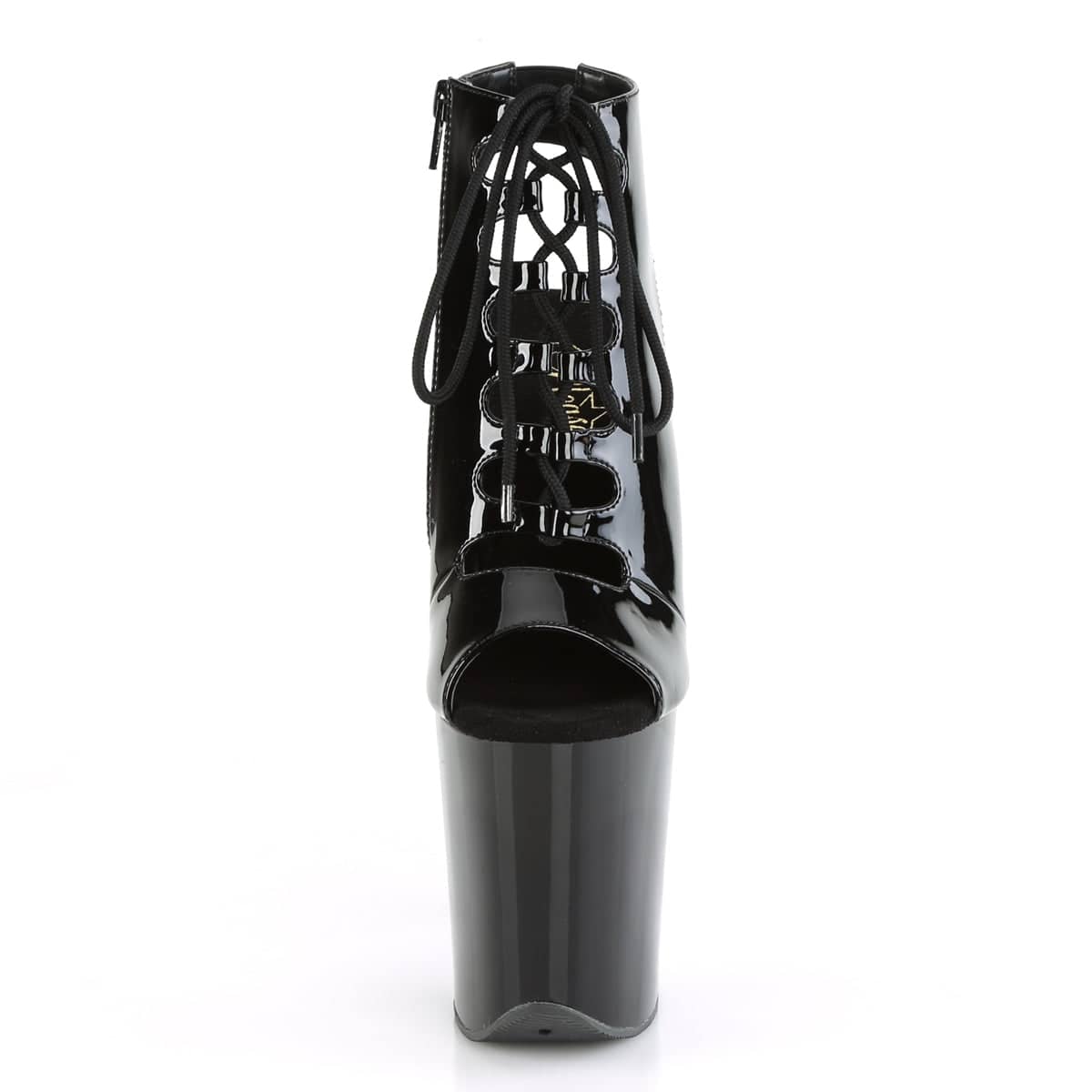 Get ready to turn heads in these 8-inch heel, 4-inch front lace-up ankle booties. Made with sexy, sleek black vegan materials, these flirty boots will add a touch of edge to any outfit. Step up your shoe game and strut your stuff in these hot numbers. Style code: FLAMINGO-800.