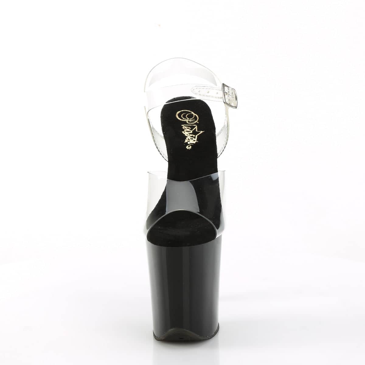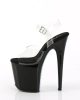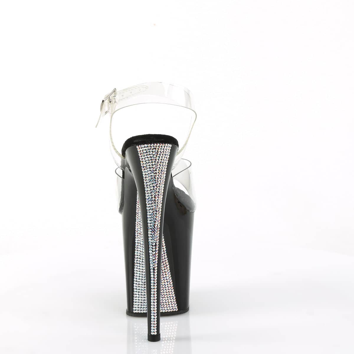 Introducing the FLAMINGO-808CRS-2 Vegan Ankle Strap Sandal. With an 8″ heel and 4″ platform, it’s the ultimate shoe for a sexy and flirty vibe. The clear and black color combination is stunning, especially with the contrast rhinestones on the platform underside and back of the heel. Get ready to turn heads and feel good about your eco-friendly choice.