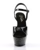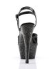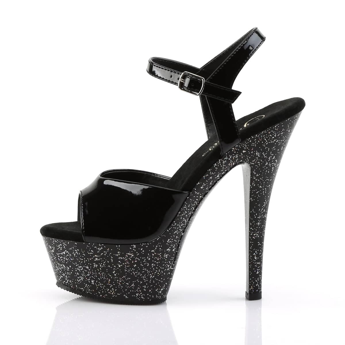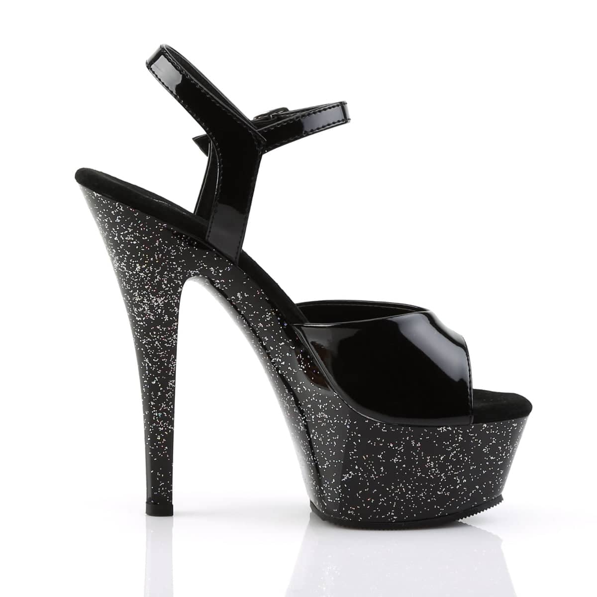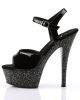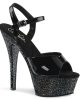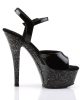 These Black Glitter Platform Sandals have a 6″ Heel (15.2cm), 1 3/4″ (4.5cm) Platform Ankle Strap Sandal w/Chrome Plated Bottom