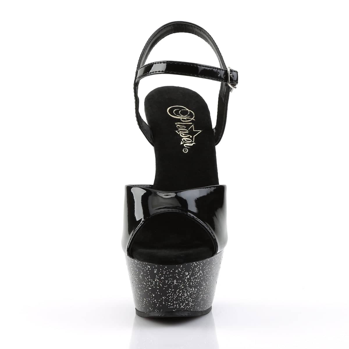 Add a touch of glitter you your look with these sexy black patent sandals which feature single strap in toe area, ankle strap with adjustable length and metallic buckle closure on the exterior side, black soft cushioning on sole for a comfortable wear and 6 inch (15 cm) stiletto high heels in black plastic embellished with iridescent glitter. The sole is made comfortable by the 1.75 inch (4.5 cm) front platform with matching glitter decor.