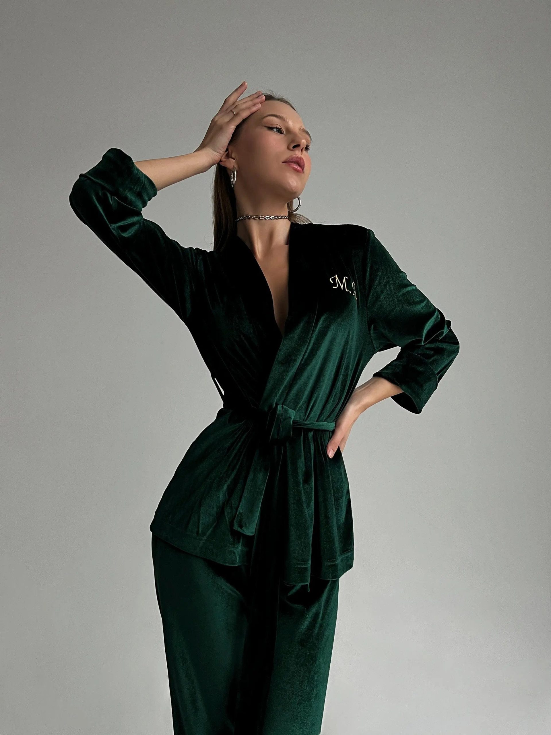 Channel your inner royal in this sumptuous bridal Robe in emerald. The elegant flowy long sleeves of the kimono will make you feel like a goddess! It doesn’t get much more luxurious – or bridal – than that. Celebrate your wedding day or any other day with this getting-ready dressing gown that’ll always remind you of your special day.