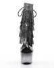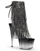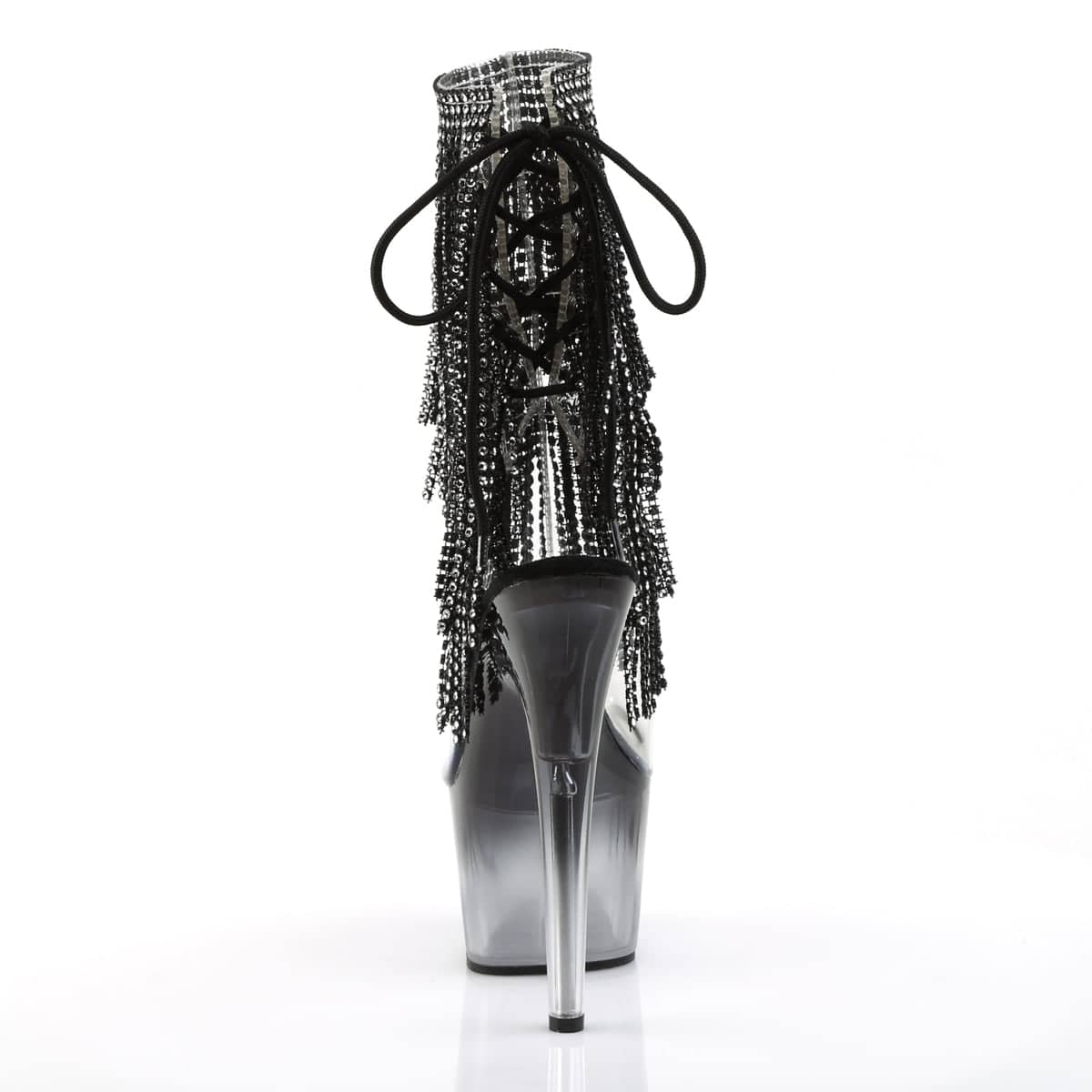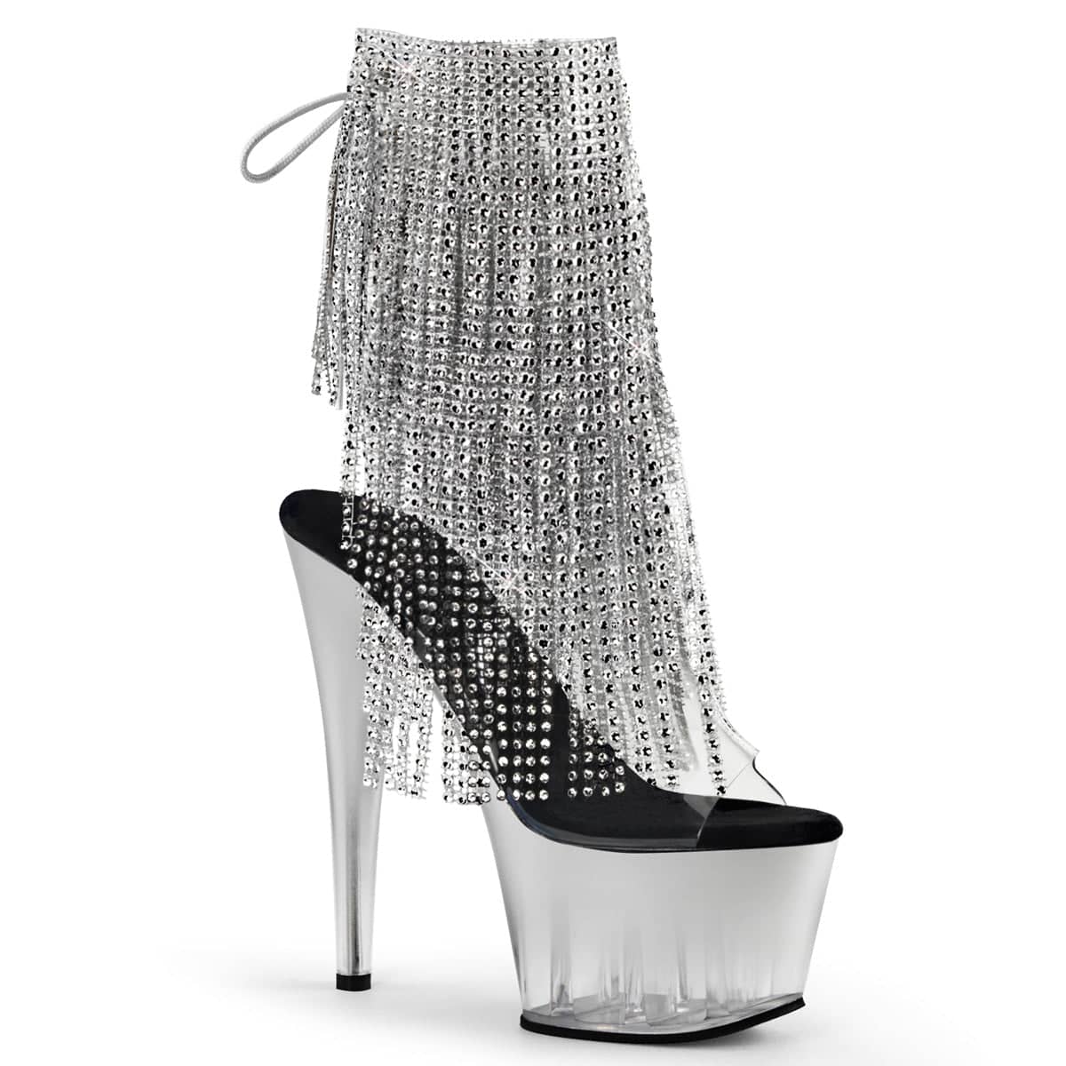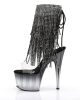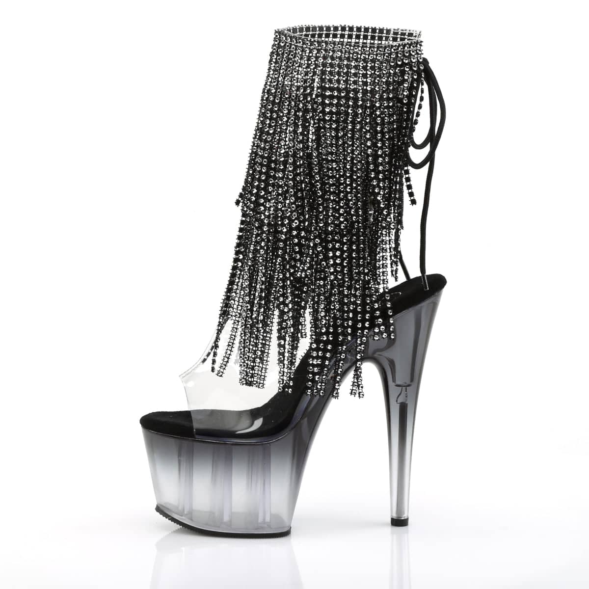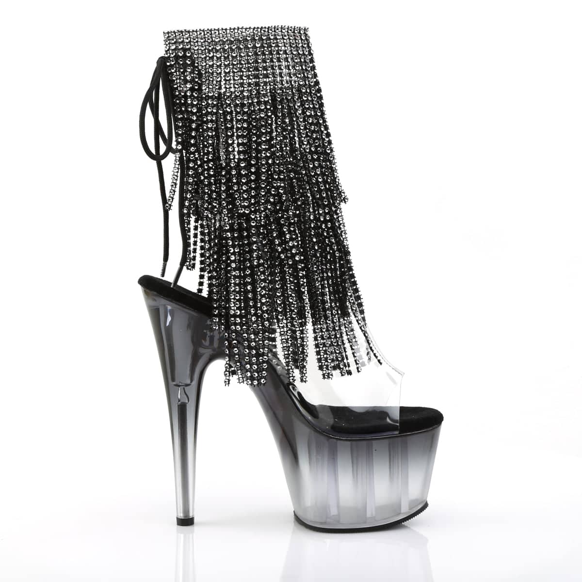 Say hello to these stunning dark rhinestoned 7 inch platform pole dancing ankle boots by Pleaser. These sexy ombre sparkly fringe boots feature a platform bottom, an open toe, stiletto heel, lace up ankle boot, simulated rhinestone fringe and inside zip closure.Â