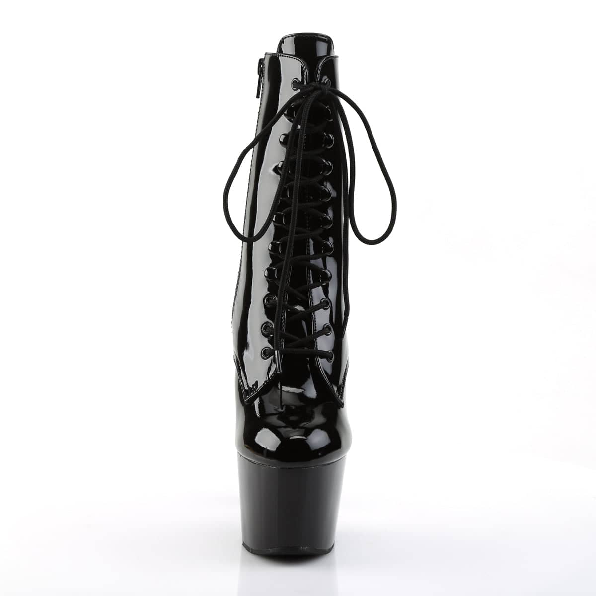 Seven inch platform Black Lace Up Mid Calf Boots with Full Inner Side Zipper. This glossy sexy black boot is perfect for pole dancing and a firm favourite with exotic dancers. The soles are made of rubber whilst the insole and lining are both PVC.Â