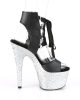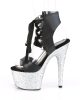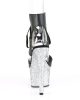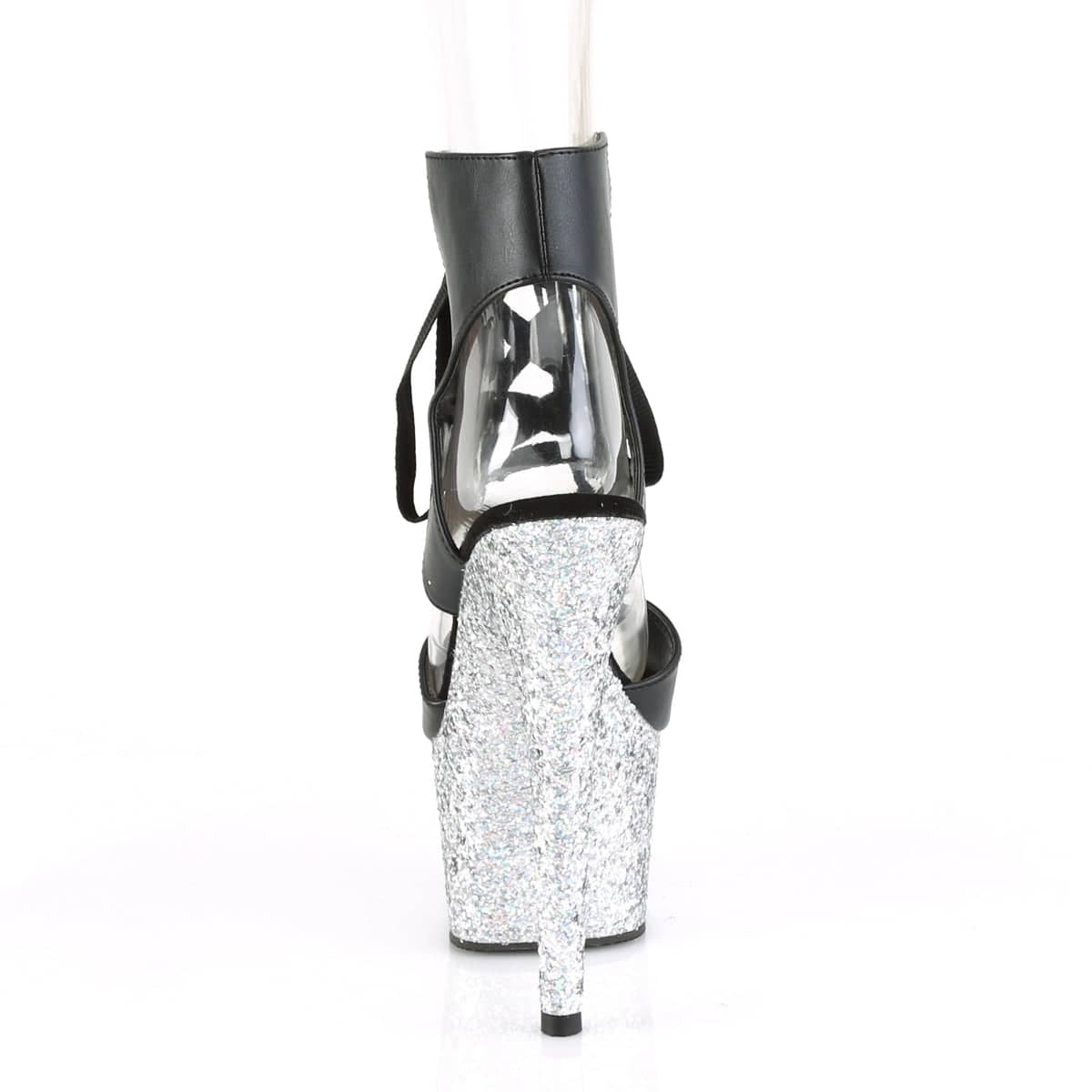 Gorgeous black faux leather and silver glitter seven inch pole dancing platform shoes by Pleaser. These stunning glitter platform sandals lace up at the ankle and feature a flattering peep toe.