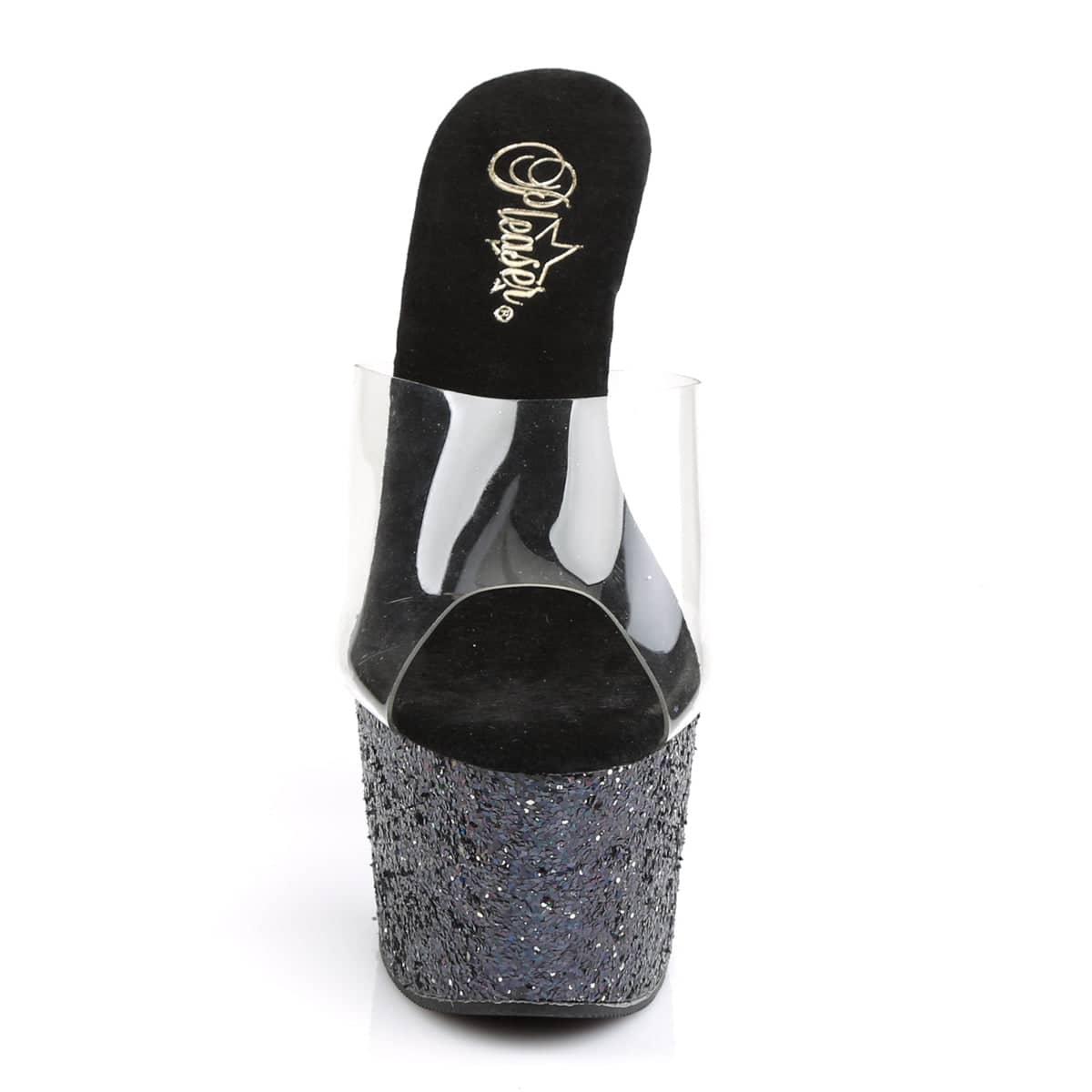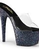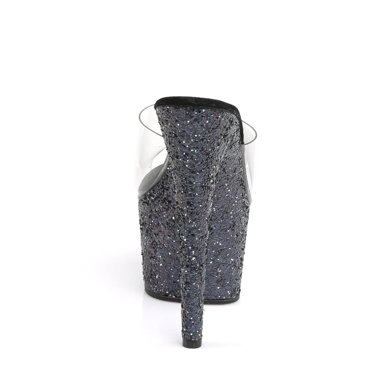 Super sparkly sexy slip on high heels. These seven inch platform mules with an open toe are perfect pole dancing platforms and will add a touch of sass to any outfit.