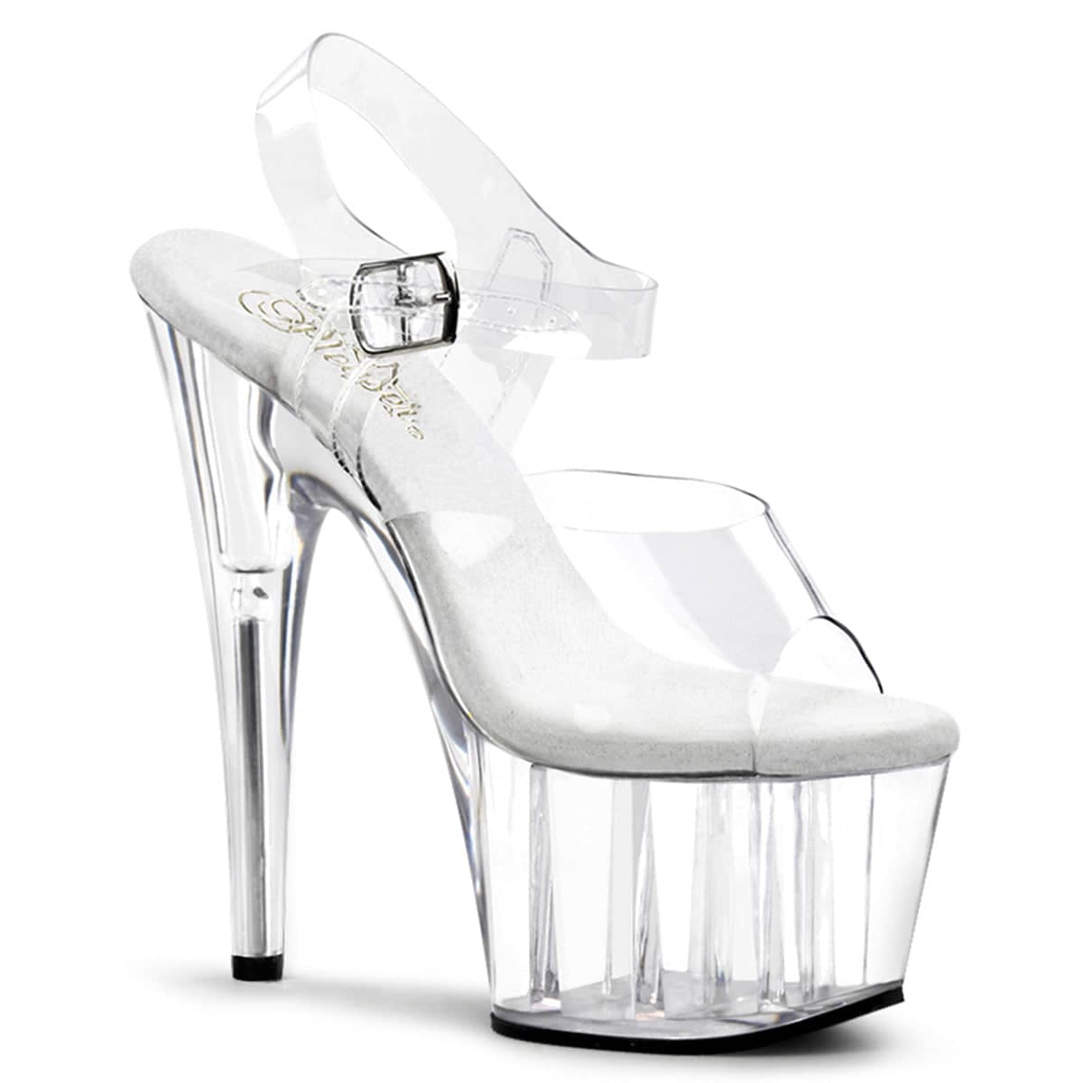 Completely clear sandals with top strap, adjustable ankle strap with metallic buckle closure and soft padding on the sole for added comfort. The lower part is also clear, with an ultra high 7 inch (17.5 cm) heel.Â