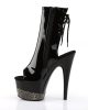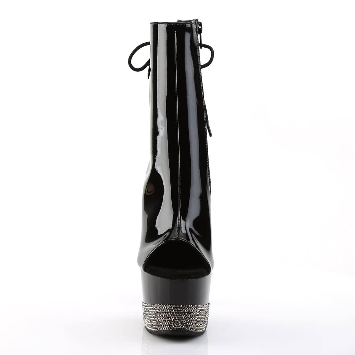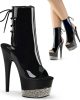 Sexy and sleek seven inch pole dancing platforms from Pleaser Shoes. These black patent peep toe boots are comfortable, flattering and perfect for pole. The rhinestone encrusted platform adds an extra sparkle and sass.Â