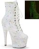 7″ (178mm) Heel, 2 3/4″ (70mm) Platform Lace-Up Front Ankle Boot Featuring Blacklight Reactive Glittered Upper and Platform Bottom, Inside Zip Closure