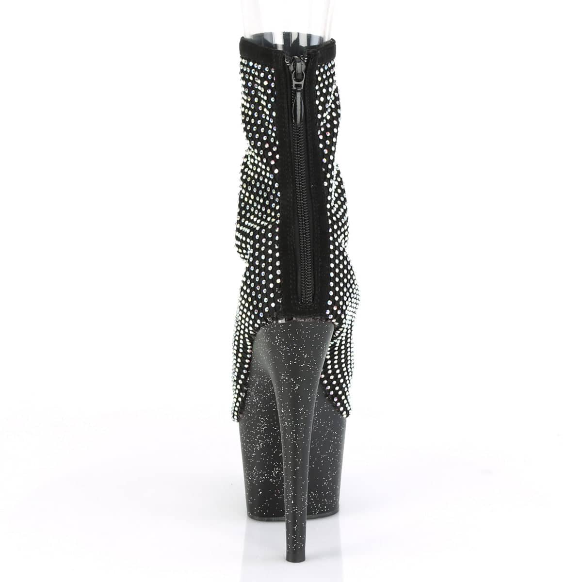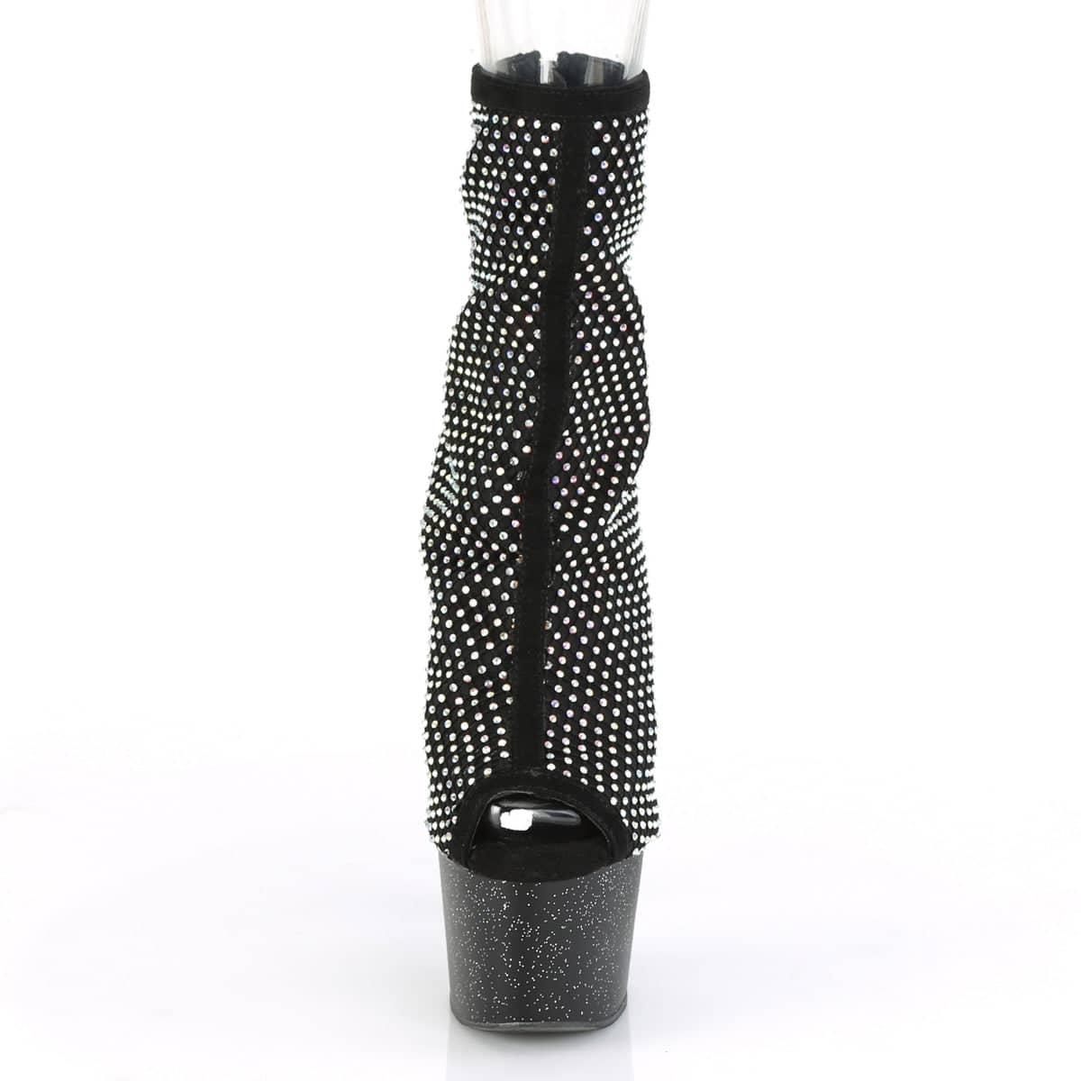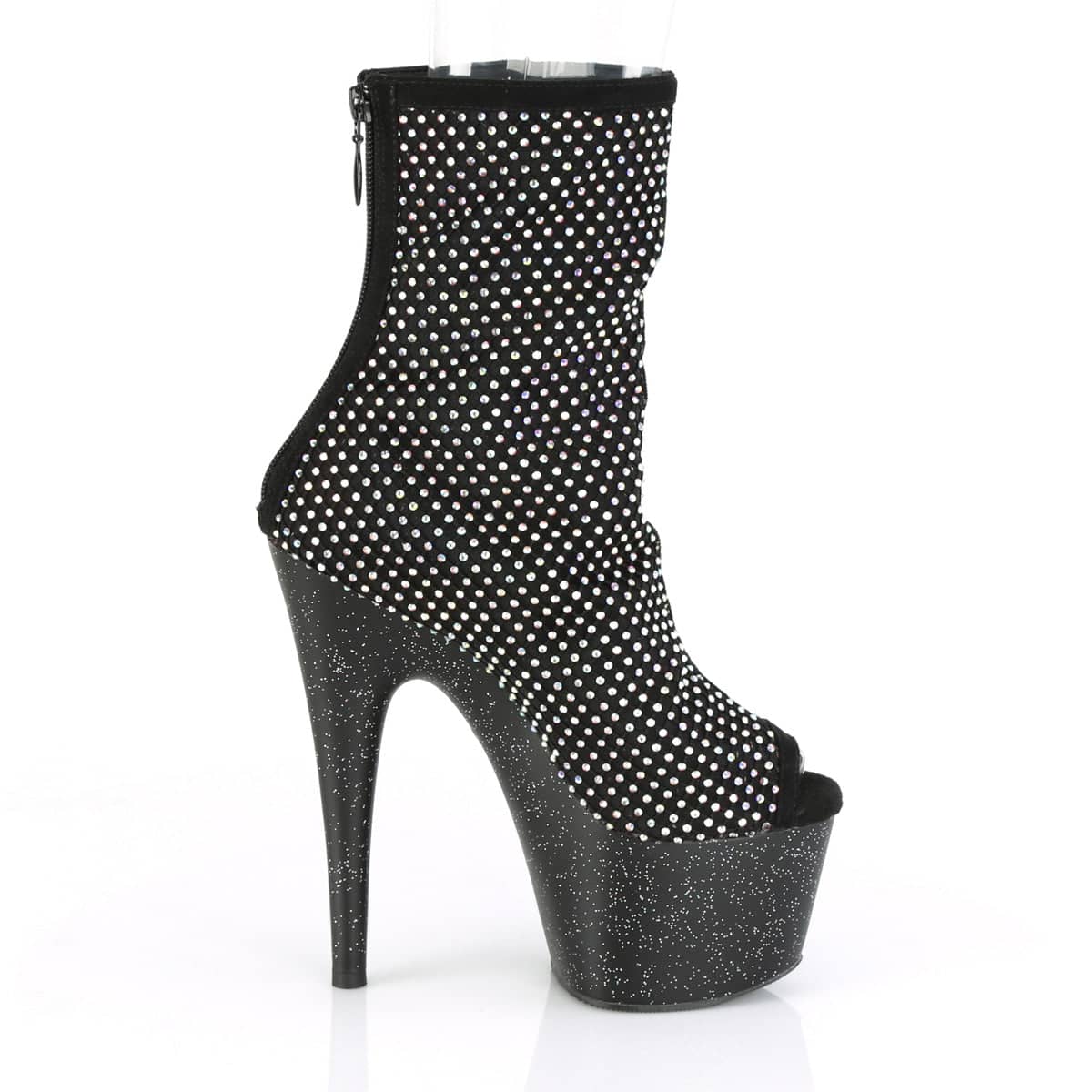 7″ (178mm) Heel, 2 3/4″ (70mm) Platform Open Toe Ankle Boot w/Mini Multi Rhinestone Upper Featuring Mini Iridescent Glitter on the Entire Platform, Back Zip Closure