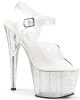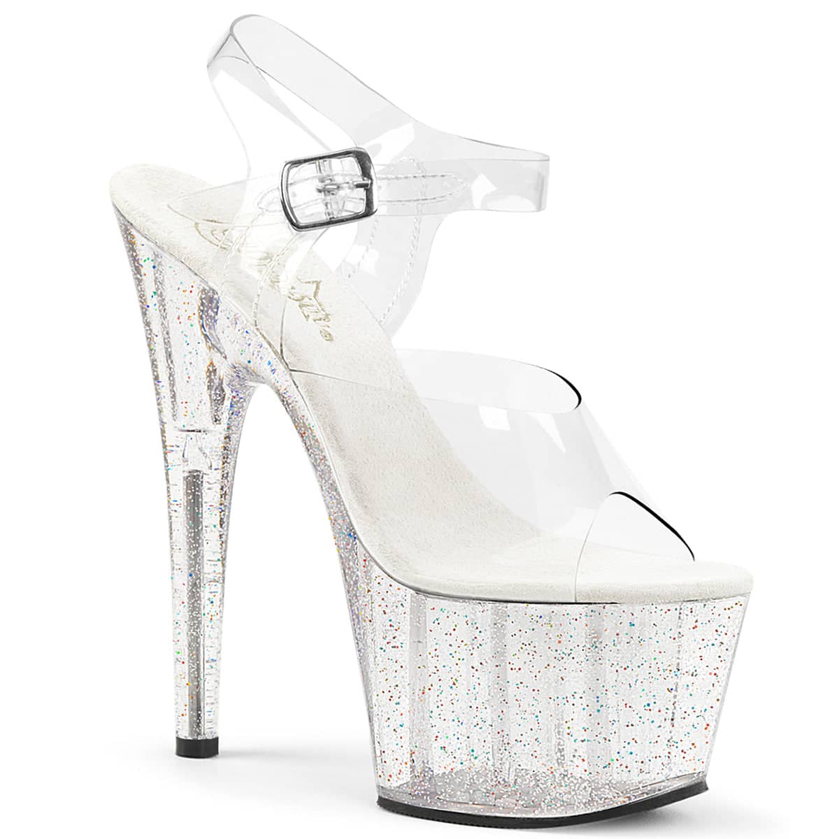 7 (17.8cm) Stiletto Heel, 2 3/4 (7cm) Platform Ankle Strap Sandal Featuring Mini Iridescent Glitter on the Entire Platform.