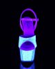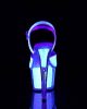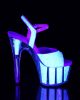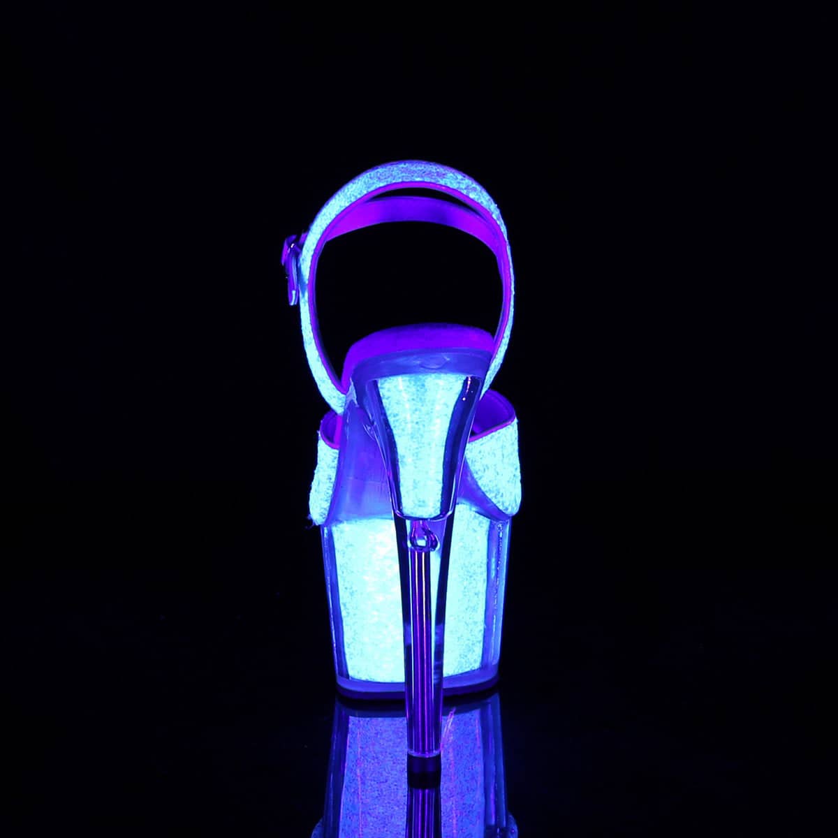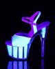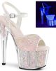 7” (178mm) Heel, 2 3/4″(70mm) Platform Ankle Strap Sandal w/UV Blacklight Reactive Glitter on the Upper and Inserts in the Platform Bottom.