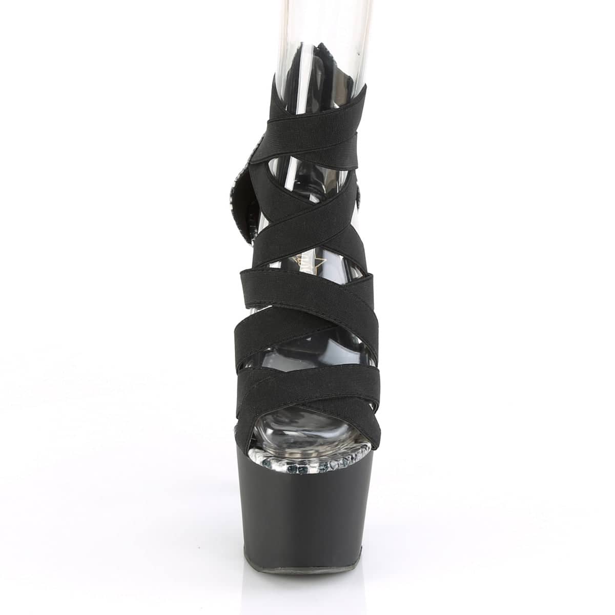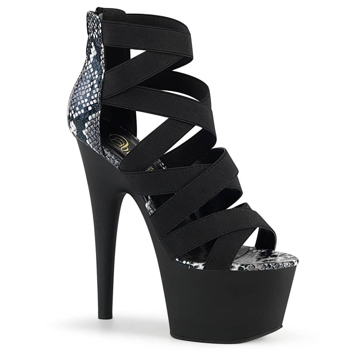7 (178mm) Heel, 2 3/4 (70mm) Platform Close Back Sandal w/ Multiple Criss Cross Elastic Straps, Back Zip Closure