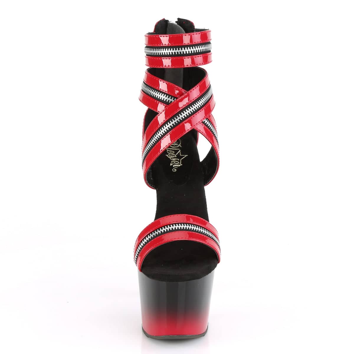 A gorgeous pair of sexy seven inch high heels with cool intricate zip detailing that wraps around the entire foot. These red hot pole dancing platforms are different and edgy and are sure to stand out.