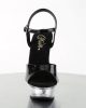 Sexy black sandals crafted in glossy patent with open toe, wide top strap and ankle straps fastened with metallic buckle. The clear platform features a soft textile cushioning for added comfort, while the sculptured high heels are crafted in metal and adorned with clear rhinestone for an exquisite look.