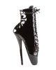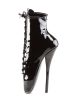 These black patent extreme 7 inch, fetish ankle boots are part of the Devious Range. Not for the faint-hearted, these sexy bad-boys come with a warning, do not attempt to walk or stand whilst wearing them! Extreme yet elegant, these scintillating heels are perfect for kinky fetishists. These ballet boots lace up and do not have a zip.Â