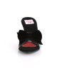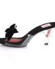 Delicate black or red slip on sandals with a stunning bow. The inner sole is padded with white soft fabric for added comfort and great feel. The front flat sole is contrasted by the 3 inch (7.5 cm) high heels in clear material for a uniform look. These bow mules can be used as statement items in a casual look or paired with club wear when you want to dance the night away!