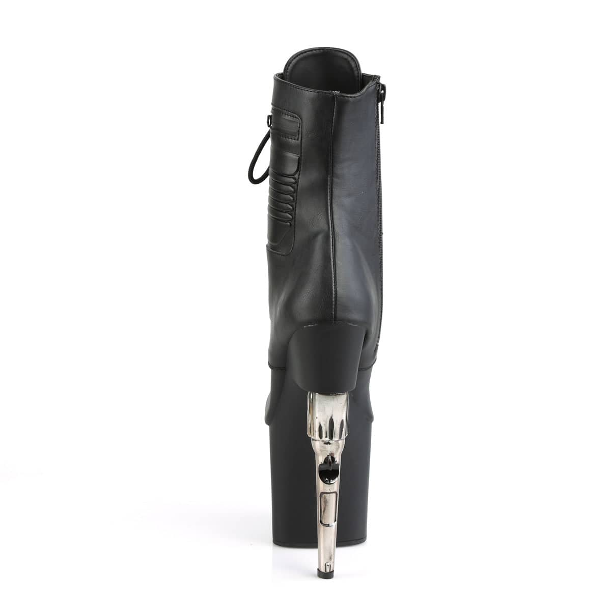 These faux leather biker style boots are incredibly versatile but come with a dangerous twist… a gun inspired heel! They’re ideal for sexy day wear or hot biker chic vibes by night. The height of the 7.5 inch heel and platform makes them perfect for pole dancing.