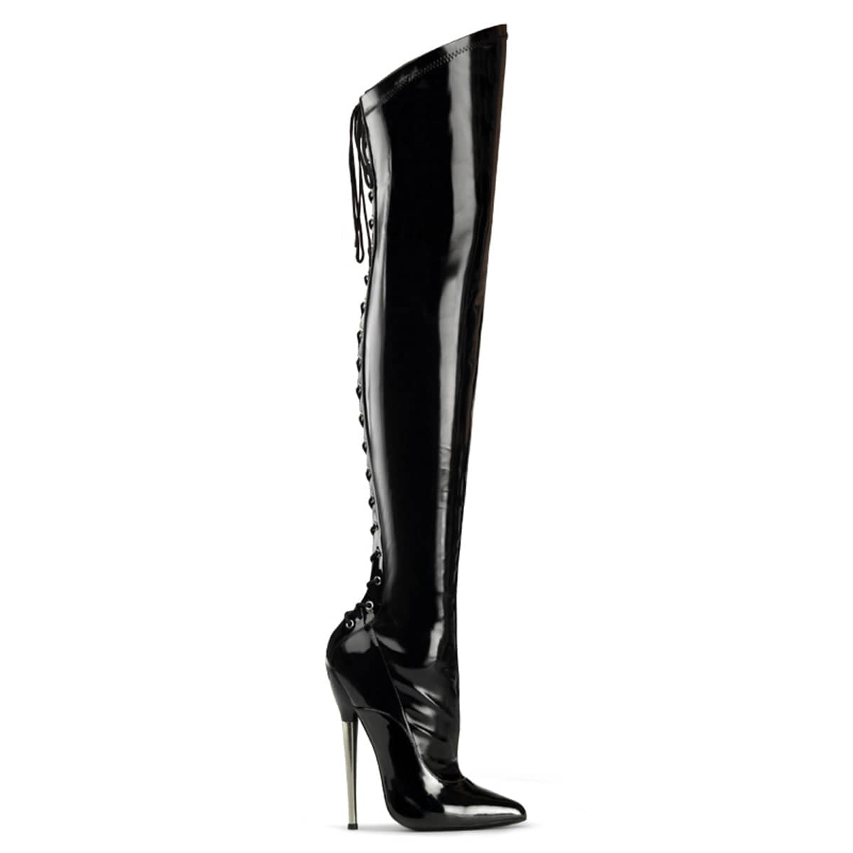 Can you handle this? Undeniably sexy black patent lace up thigh high boots, perfect for fetishists and kinky customers. These seriously hot 6 inch heels will be sure to set the right tone. The lace up keeps the boot tightly fitted, whilst the full inner side zipper makes them easy to dress or undress. This style is part of the Devious Range.