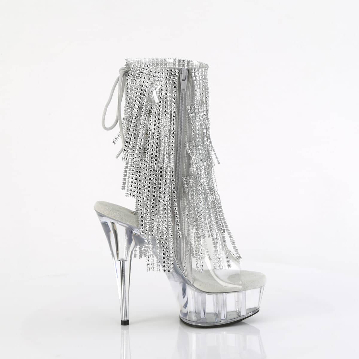 6 (15.2cm) Stiletto Heel, 1 3/4 (4.5cm) Platform Open Toe/Heel Back Lace-Up Ankle Boot Featuring Chrome Plated Platform & 4-Layer Chrome Plated, Simulated Rhinestone Fringe, Inside Zip Closure