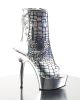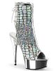 Dazzle them in these amazing holographic faux ostrich skin six inch pole dancing platform boots with peep toe. These boots feature a stiletto heel, a reflective chrome plated platform, lace up back and hidden inside zip closure.Â