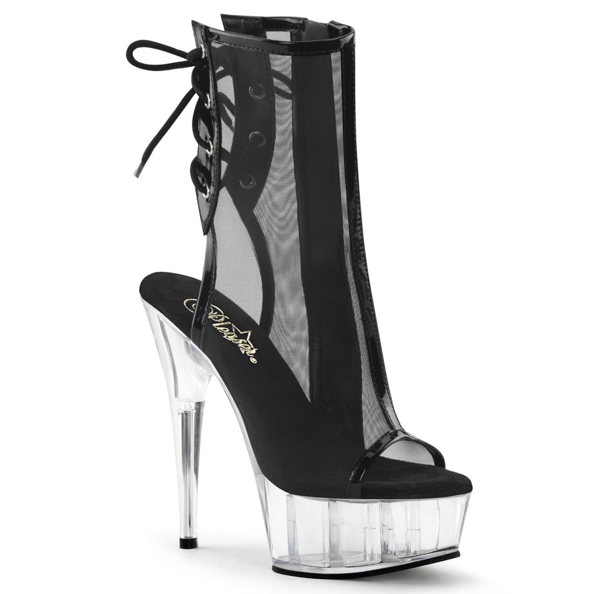 Sexy and sleek six inch pole dancing platforms from Pleaser Shoes. These black mesh peep toe boots are comfortable, flattering and perfect for pole. They are versatile and can be worn from day to night.