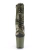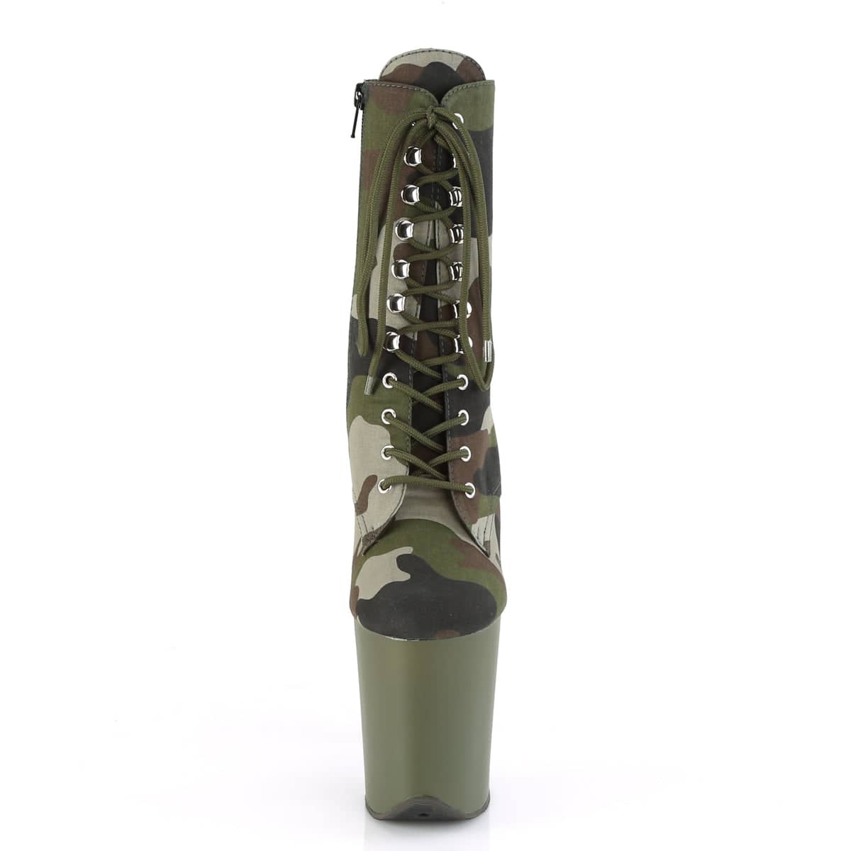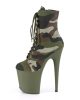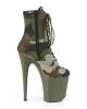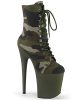 Attention! These army-inspired boots are sure to command attention. Featuring a camouflage upper section and matching khaki green platform base, these 8 inch pole dancing platform ankle boots are different but on trend.