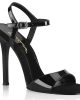 Versatile black patent sandals with open toe design, toe strap with wider sides and thinner top and two side straps which support a thin ankle strap with side metallic buckle closure. The dazzling 4.5 inch (11.5 cm) stiletto heels in matching colour complete the the look and add that playful touch.