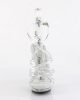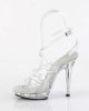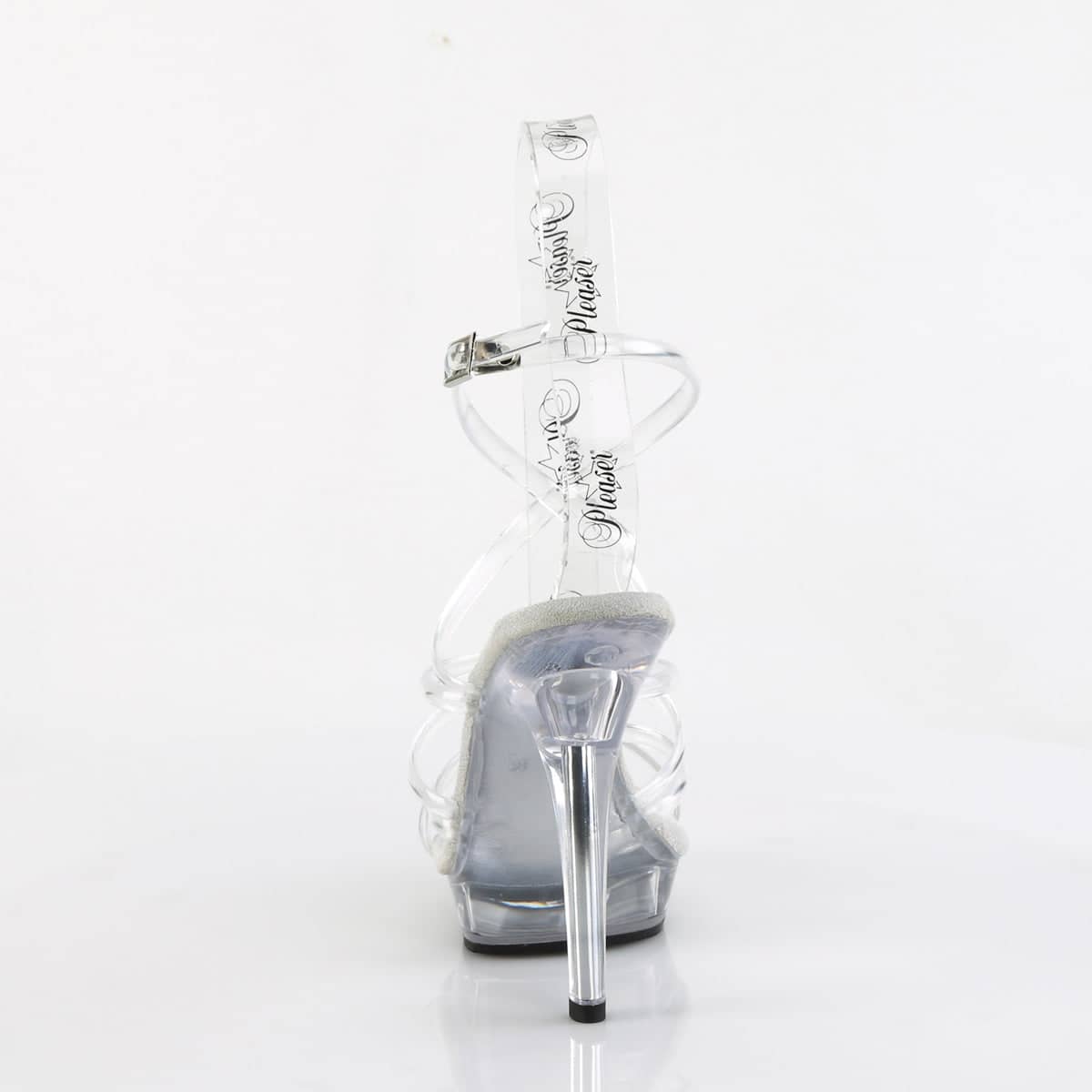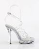 Clear sandals with criss-cross pattern, clear 5 inch (12.5 cm) sexy heels and matching 0.75 inch (2 cm) front platform. The first funnel-like pair of straps wraps around the toes, the second keeps the toes in place, while the third one wraps around the ankle and fastens on the exterior side with a discreet metallic buckle. The white sole cushioning adds further charm, while creating a perfect environment for the foot.Â
