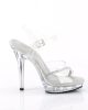 Stylish clear sandals with wide strap, peep-toe, crystal adornment on the clear strap and silver side straps which support a thin silver ankle strap. The sandals close with a metallic buckle on the exterior side. A clear 5 inch (12 cm) high stiletto heel lifts and sculpts the leg for a seductive appearance, while the 0.75 inch (2 cm) front platform balances the sole and creates a comfortable position for the foot.