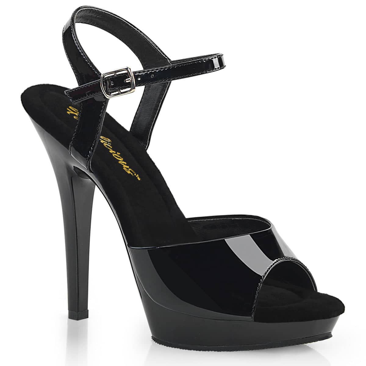 Chic black patent sandals featuring a single toe strap with wider sides and thin middle, side straps which support an ankle strap with side closure and 5 inch (12.5 cm) high heels. The 0.75 inch (2 cm) front platform minimises the front-heel difference and creates a comfortable sole for the feet.Â