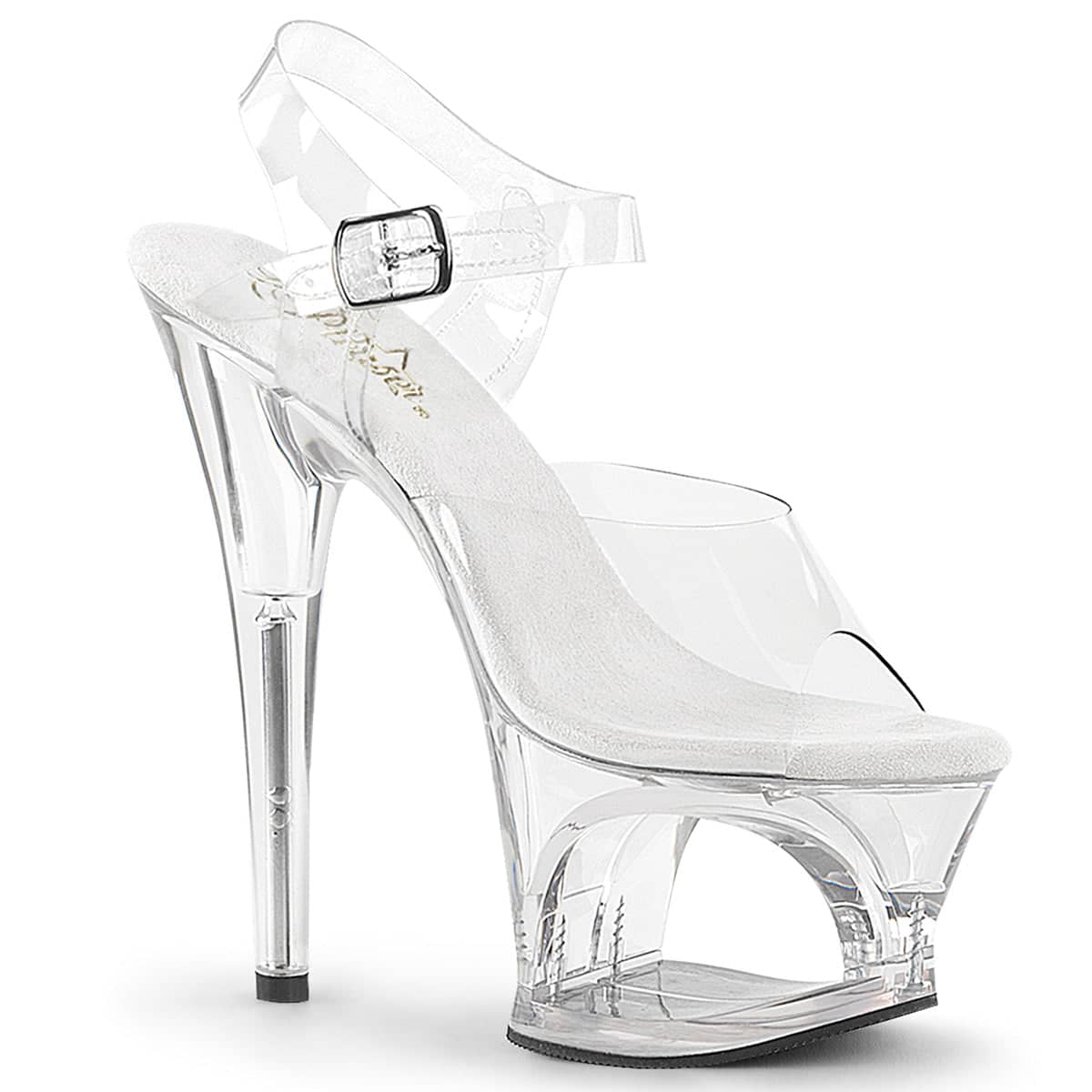 Stunning sandals with dazzling 7 inch (17.5 cm) high stiletto heel, supporting high front hollowed platform and soft silver padding for a comfortable experience. The top is made in clear plastic which reveals the foot for a tantalizing look. The metallic buckle closure enables an easy put on and adds extra stability to these daring sandals.