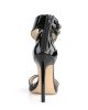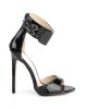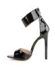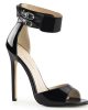 Irresistible minimalist sandals in black or red patent with dazzling 5 inch (12.5 cm) stiletto high heels, single front strap, full heel for added support, hidden back zipper and wide ankle strap with adjustable size and double metallic buckle closure on the exterior side.