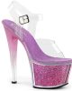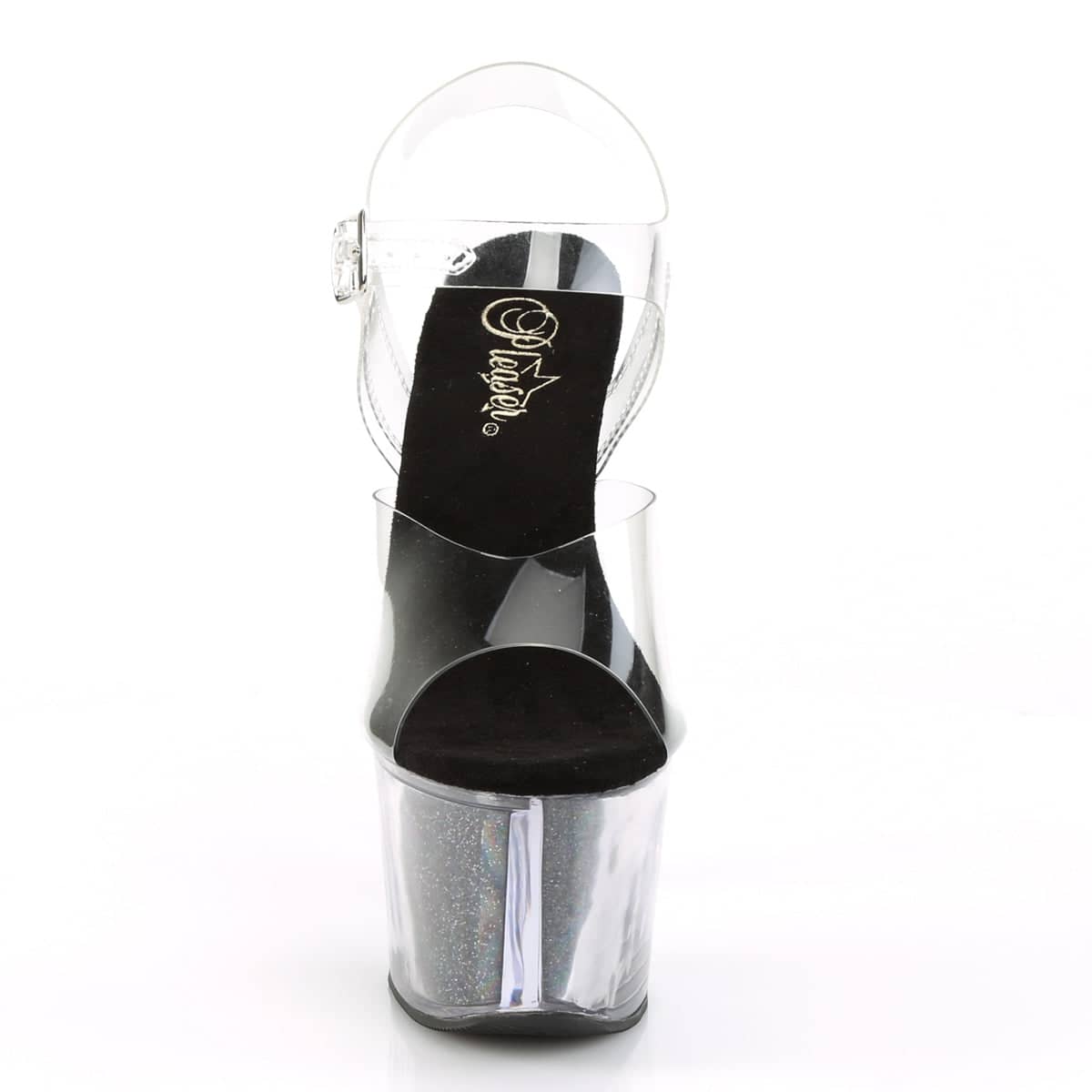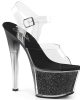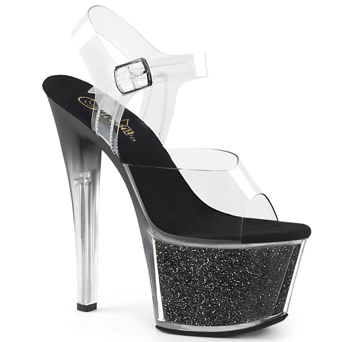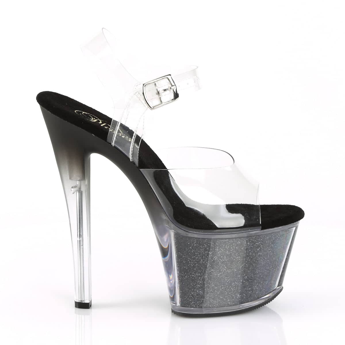 SKY-308G – Get ready to turn heads in these Vegan, Clr/Blk Glitter Inserts SKY-308G-T ankle-strap sandals. Boasting a 7″ heel with a 2 3/4″ PF and a teasing tinted heel, they’re the perfect combination of sexy and flirty. Step out in style and stay cruelty-free.