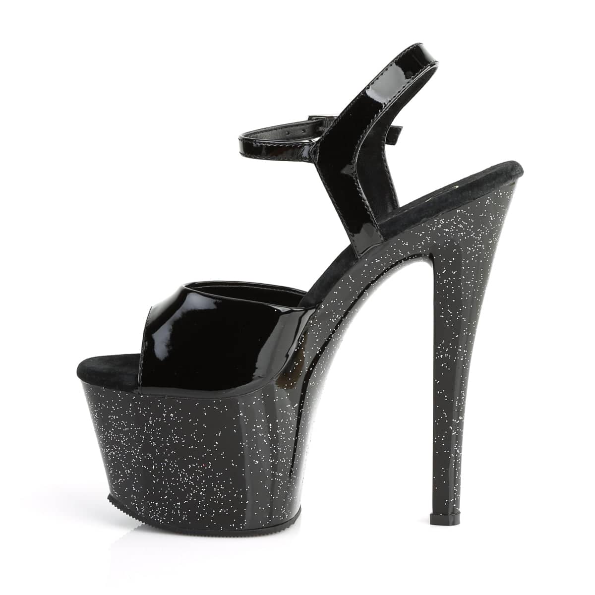 Indulge in these sizzling SKY-309MG Vegan Sandals! Made with love for animals, these sexy shoes exude glam and sophisticated vibe with mini iridescent glitter all over the black bottom — lifted by a 7″ heel and a 2 3/4″ platform to amp up your confidence. Perfect for any flirty occasion!