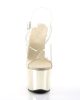 Step up your game with our SKY-308 Vegan Clear/Gold Chrome ankle strap sandal. With a 7″” heel and a flirty 2 3/4″” platform, these sexy shoes will take you to the next level. The chrome-plated bottom adds a touch of glam, while the vegan material keeps you guilt-free. Get ready to turn heads in style!