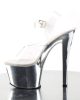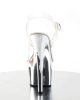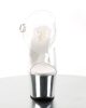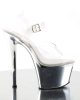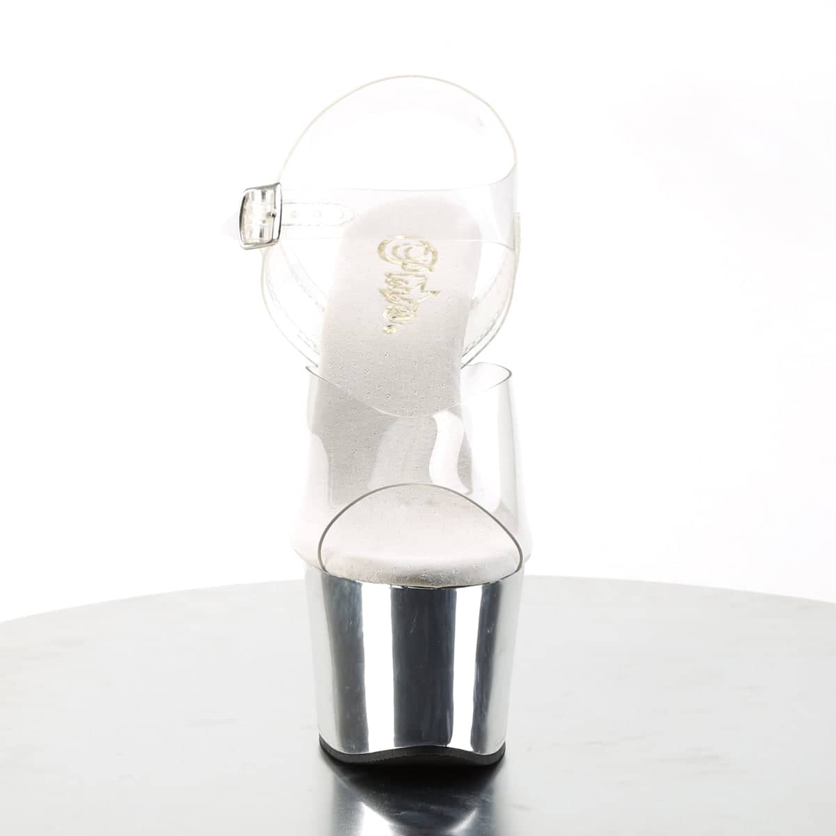 SKY-308 Ankle Strap Sandal – Clear/Silver Chrome with a 7″” (17.8cm) heel and 2 3/4″” (7cm) platform. Flaunt your legs in these sexy, flirty and vegan shoes. Chrome plated bottom? It’s like stiletto magic. Get ready to own the night.