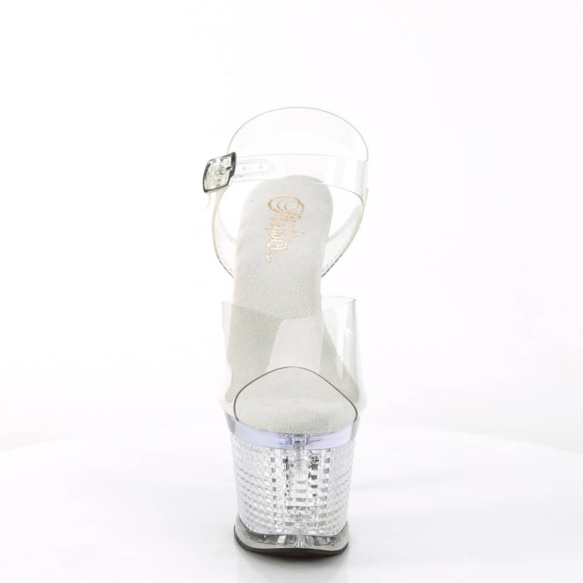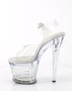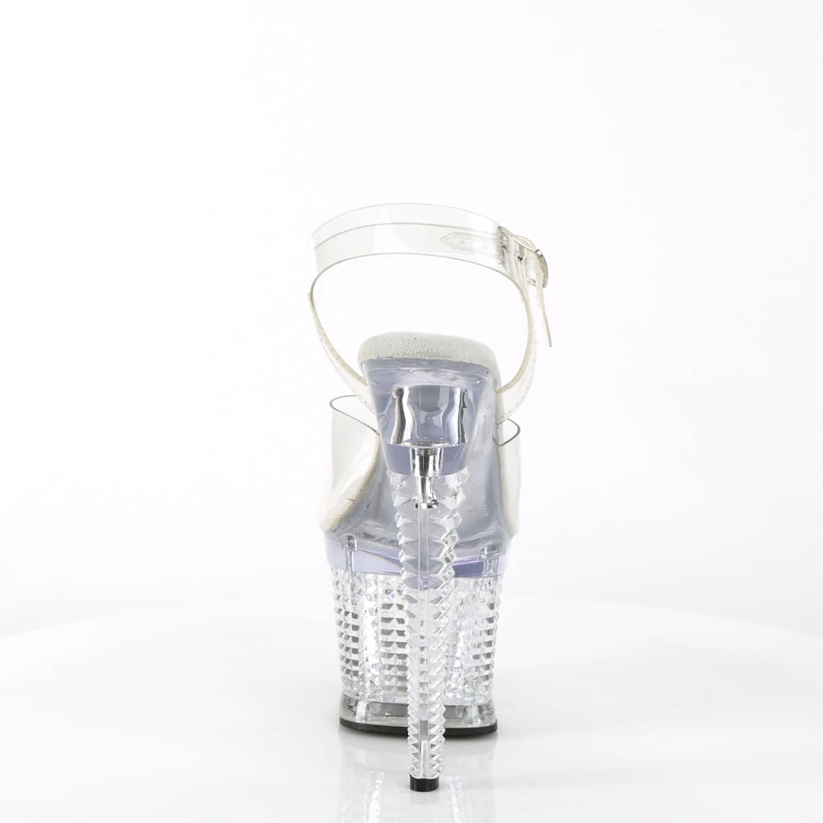 Introducing the SPECTATOR-708, a clear and vegan ankle strap sandal with a towering 7″ heel and 3″ textured platform. These sexy shoes will make heads turn with their flirty style that effortlessly elevates any outfit. Snatch them up now for a look that’s sure to turn up the heat!